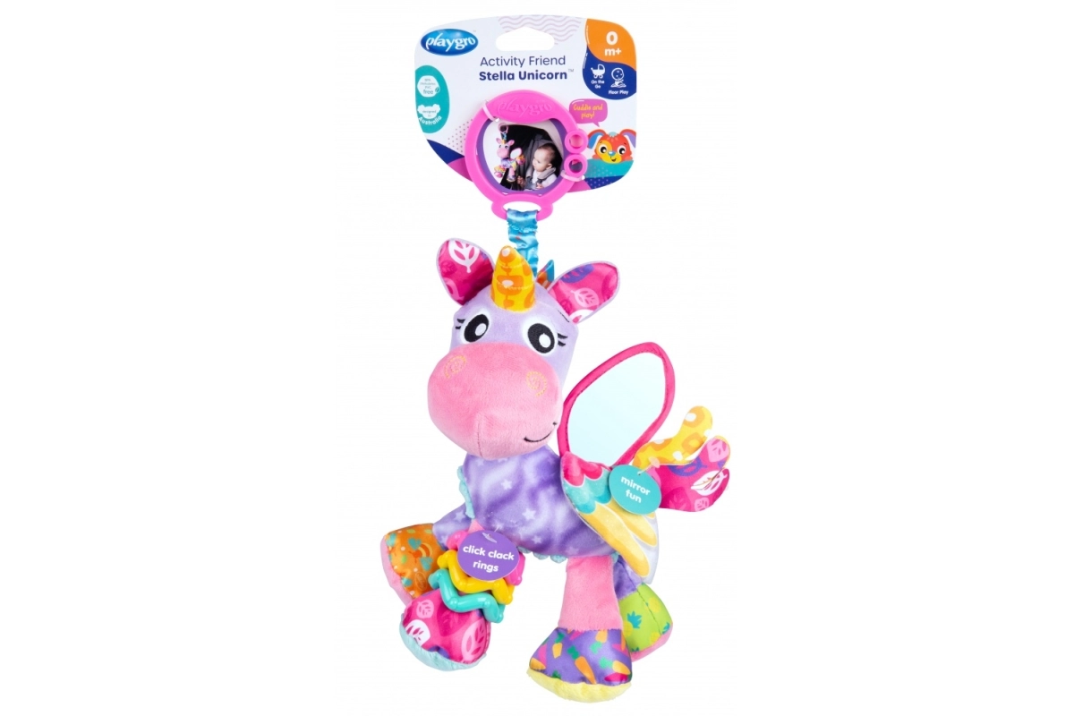 Η χαριτωμένη μονόκερος Stella από την Playgro είναι ένα απαλό κρεμαστό παιχνίδι για τα πιο μικρά μωρά, που υποστηρίζει την ανάπτυξη των αισθήσεων και διασκεδάζει τόσο στις βόλτες όσο και στο σπίτι. Προσφέρει καθρεφτάκι για αυτοανακάλυψη, θροΐζοντα και κουδουνιστά στοιχεία, διάφορες υφές και έντονα αντιθετικά μοτίβα για διέγερση της όρασης, της αφής και της ακοής. Χάρη στον πρακτικό C κλιπ το προσαρμόζετε εύκολα στο καρότσι, στο κάθισμα αυτοκινήτου ή στην κούνια.