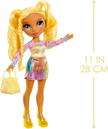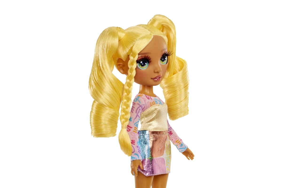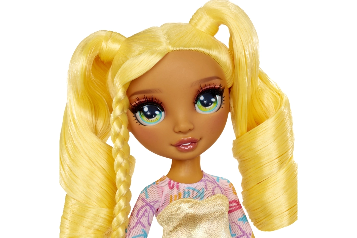 Η Sunny από το RAINBOW HIGH είναι μια αυτοπεποίθητη μούσα μόδας που εμπνέει τα παιδιά να εκφράσουν τη δική τους μοναδικότητα. Το outfit της συνδυάζει λαμπερά κίτρινα και ουράνιο-τόξο στοιχεία – εντυπωσιακό τοπ, διαχρονική φούστα, κομψές γόβες και τσάντα στον ίδιο τόνο. Τα μαλλιά της σε παιχνιδιάρικες κοτσίδες προσκαλούν σε δημιουργικότητα στο χτένισμα.