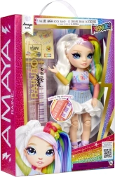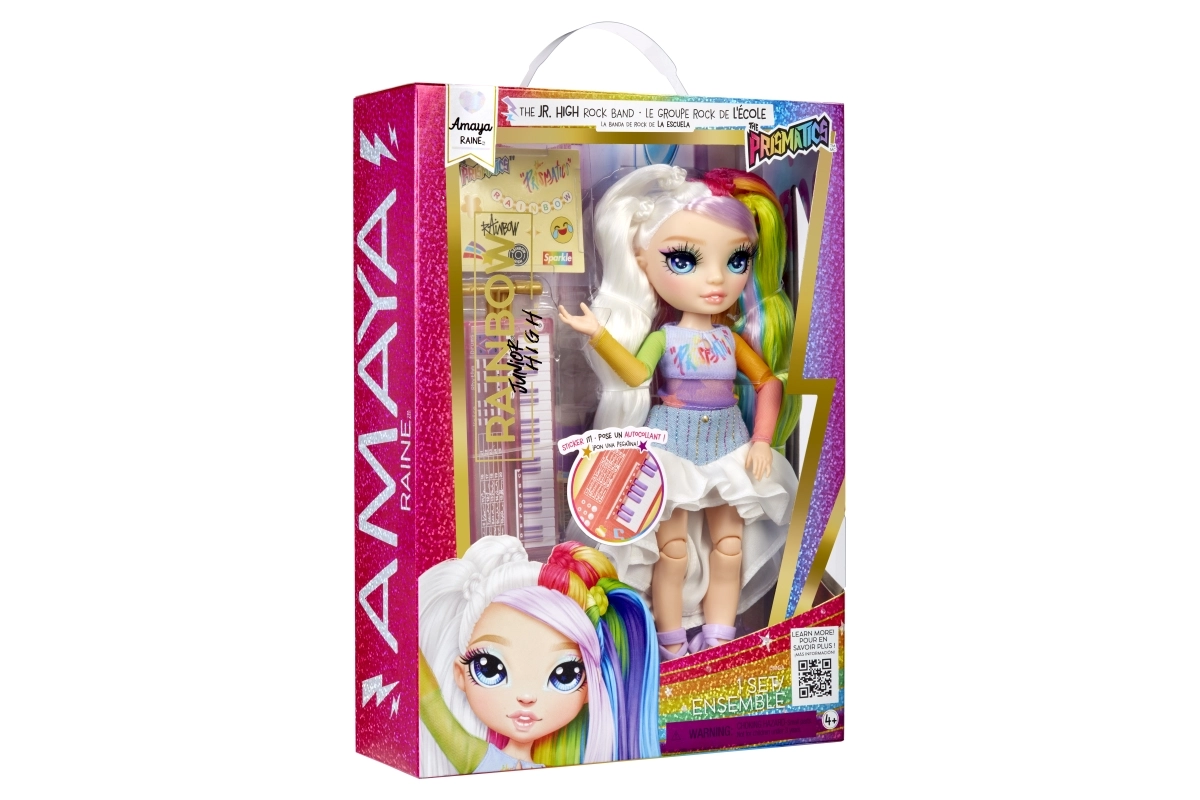 Η Amaya Raine από τη σειρά Rainbow High Jr. High φέρνει στα παιδιά τον κόσμο της μόδας και της μουσικής σε μία χαριτωμένη κούκλα. Με μακριά μαλλιά ουράνιου τόξου, προσεγμένο ντύσιμο και αρθρώσεις, είναι έτοιμη για συναυλίες, φωτογραφήσεις και έκθεση στο ράφι. Τα αξεσουάρ, συμπεριλαμβανομένων των μίνι πλήκτρων, ενισχύουν το παιχνίδι ως μουσικό αστέρι.