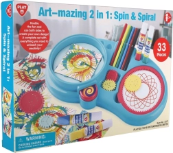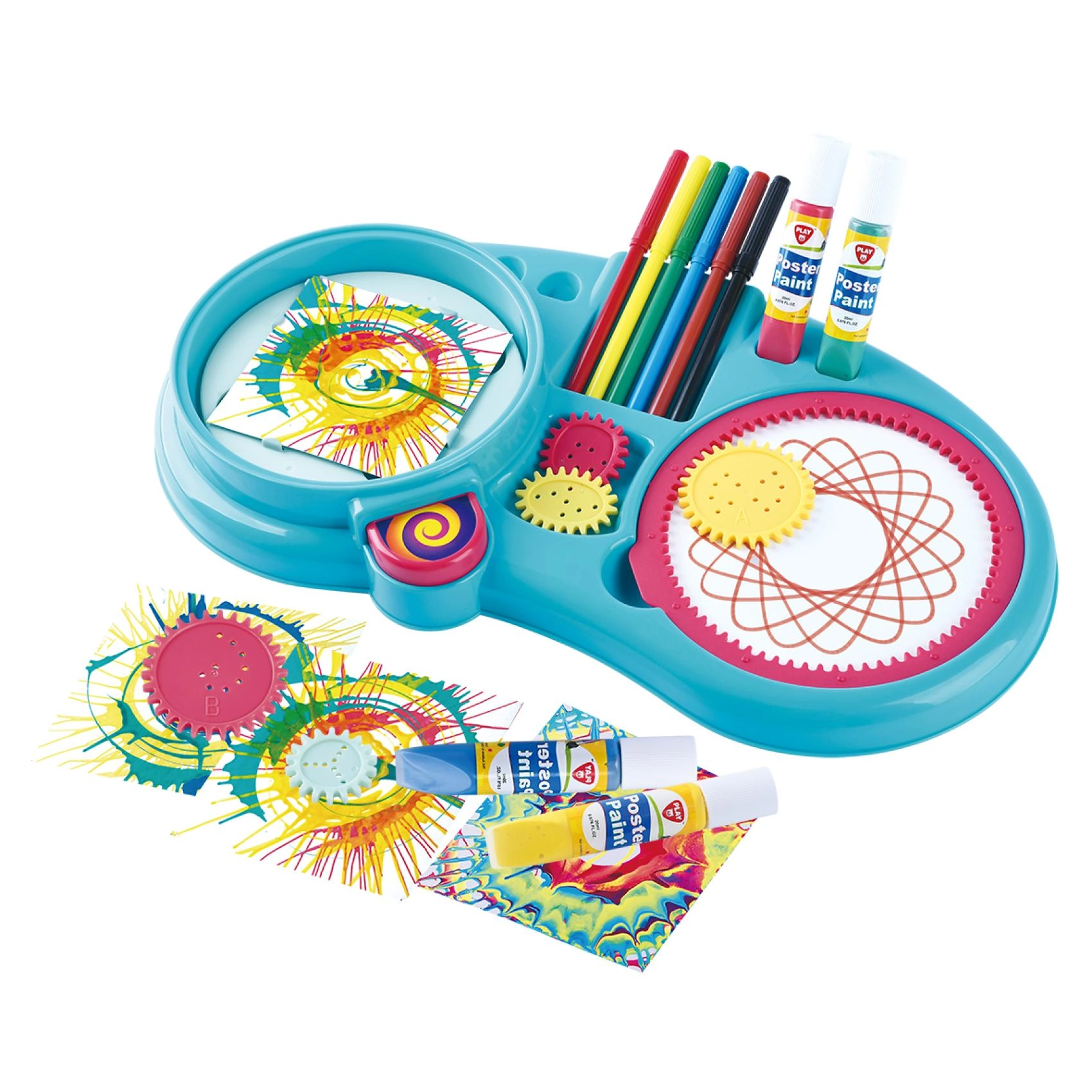 Ένα σετ, δύο τεχνικές. Δημιουργήστε τέλειες σπείρες με τα γρανάζια ή αφήστε τα χρώματα να χορέψουν πάνω στο περιστρεφόμενο χαρτί για εντυπωσιακές spin‑art εικόνες.