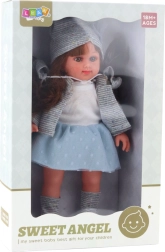 Η χαριτωμένη κούκλα SWEET ANGEL με ύψος 36,5 εκ. σε ένα κομψό γκρι σετ (φορεματάκι, ζακετάκι, σκουφάκι και παπουτσάκια) θα χαροποιήσει κάθε παιδί. Είναι μαλακή, ευχάριστη στην αφή και σχεδιασμένη για τους μικρότερους – υποστηρίζει την ανάπτυξη της φαντασίας, των συναισθημάτων και το role-play στο παιχνίδι οικογένειας.