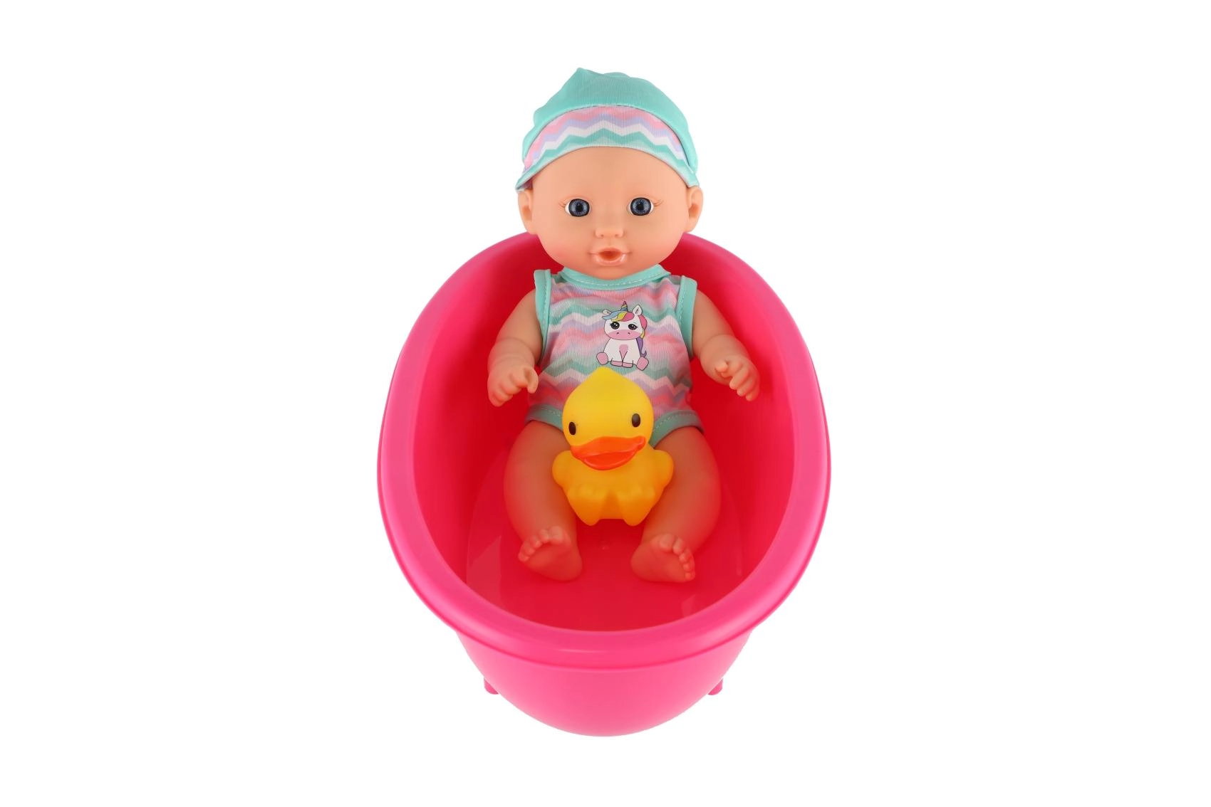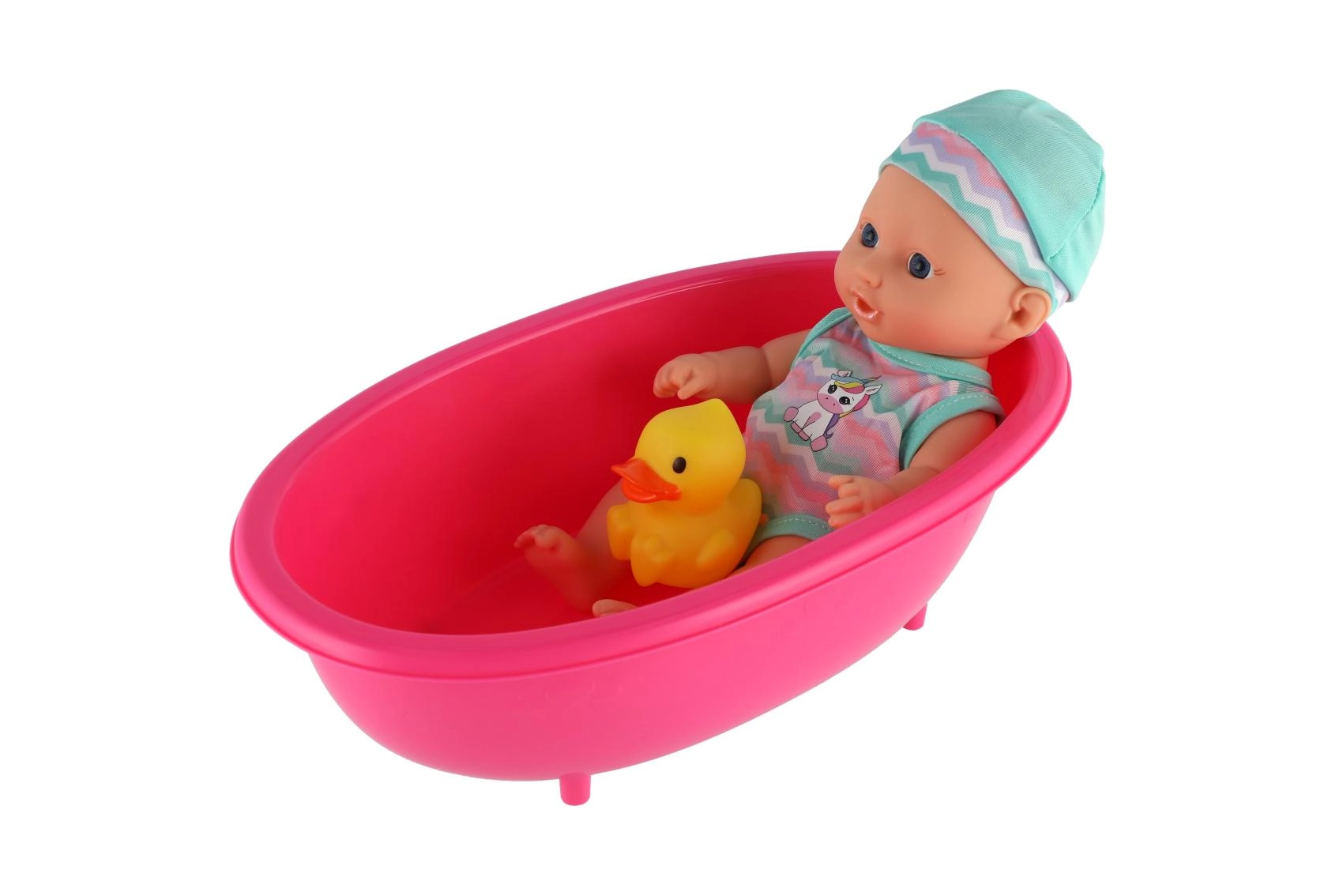 Η κουκλίτσα στη μπανιέρα με το κίτρινο παπάκι δημιουργεί έτοιμη σκηνή για παιχνίδι ρόλων και καθημερινές ρουτίνες φροντίδας μωρού.