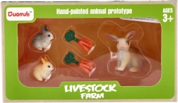 Χαριτωμένο σετ τριών πλαστικών κουνελιών με αξεσουάρ για δημιουργικό παιχνίδι. Ενισχύει τη φαντασία, την ενσυναίσθηση και τη λεπτή κινητικότητα. Ιδανικό για παιδικό κουκλόσπιτο ή φάρμα ζώων, εξαιρετικό επίσης ως δώρο χάρη στο πρακτικό κουτί.
