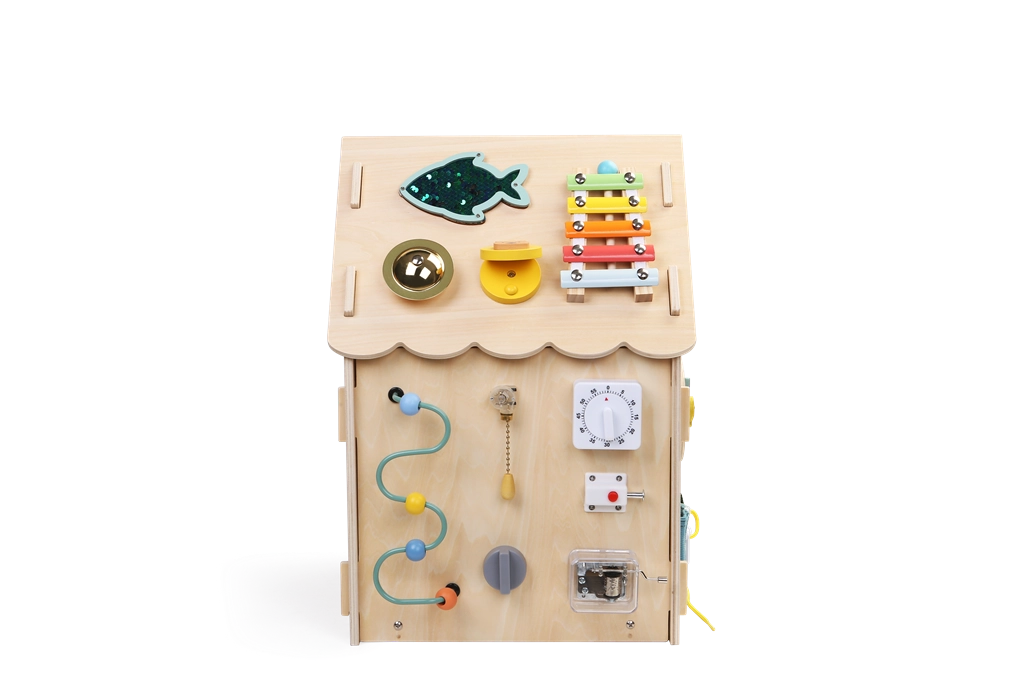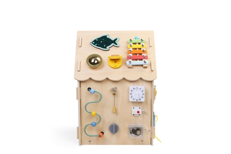 Το σπιτάκι ενισχύει τη συγκέντρωση, την υπομονή και καθημερινές δεξιότητες όπως το κούμπωμα φερμουάρ και κουμπιών, το δέσιμο κορδονιών ή η χρήση αγκράφας. Η στιβαρή ξύλινη κατασκευή, οι λείες άκρες και τα μη τοξικά χρώματα εξασφαλίζουν ασφαλή χρήση.