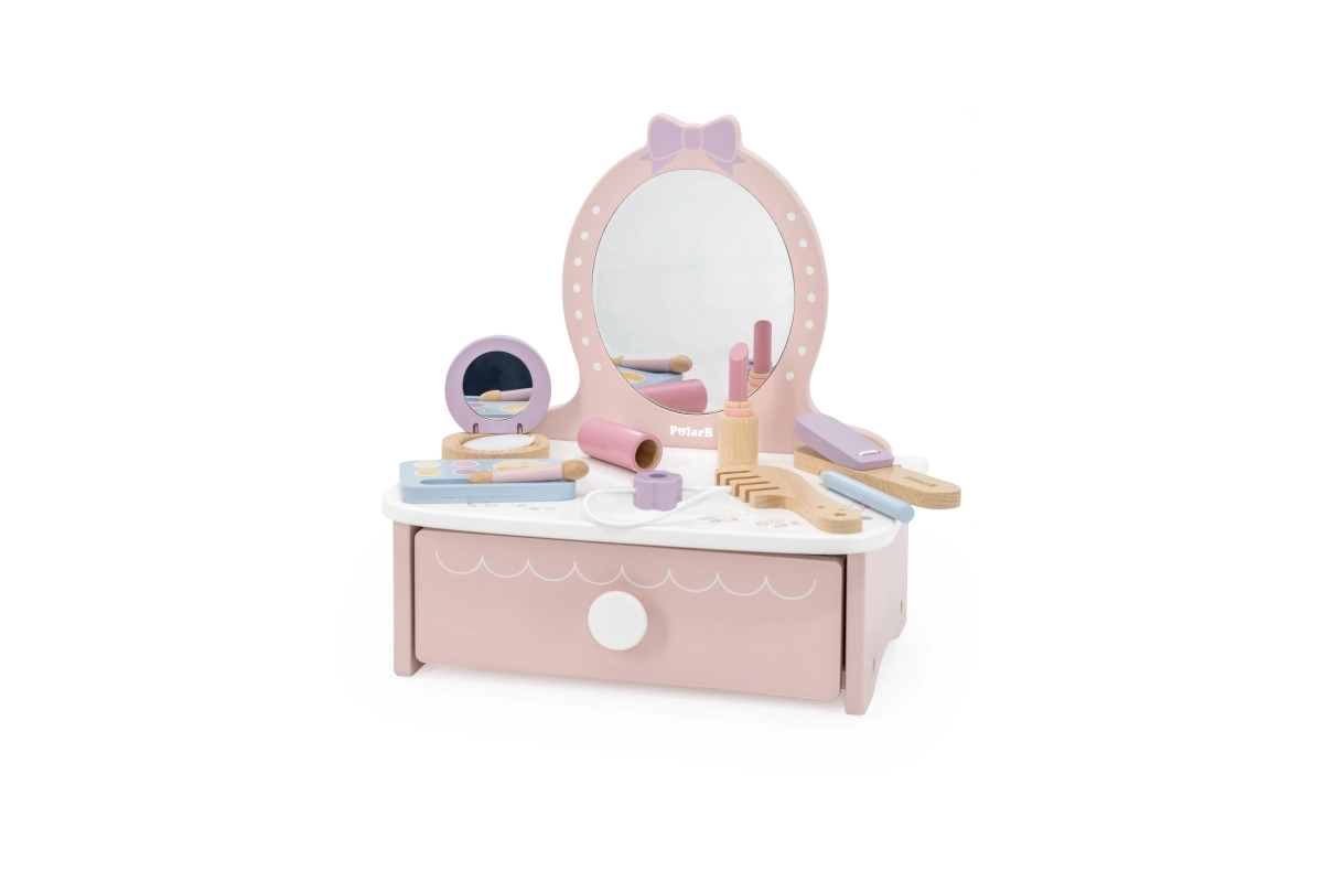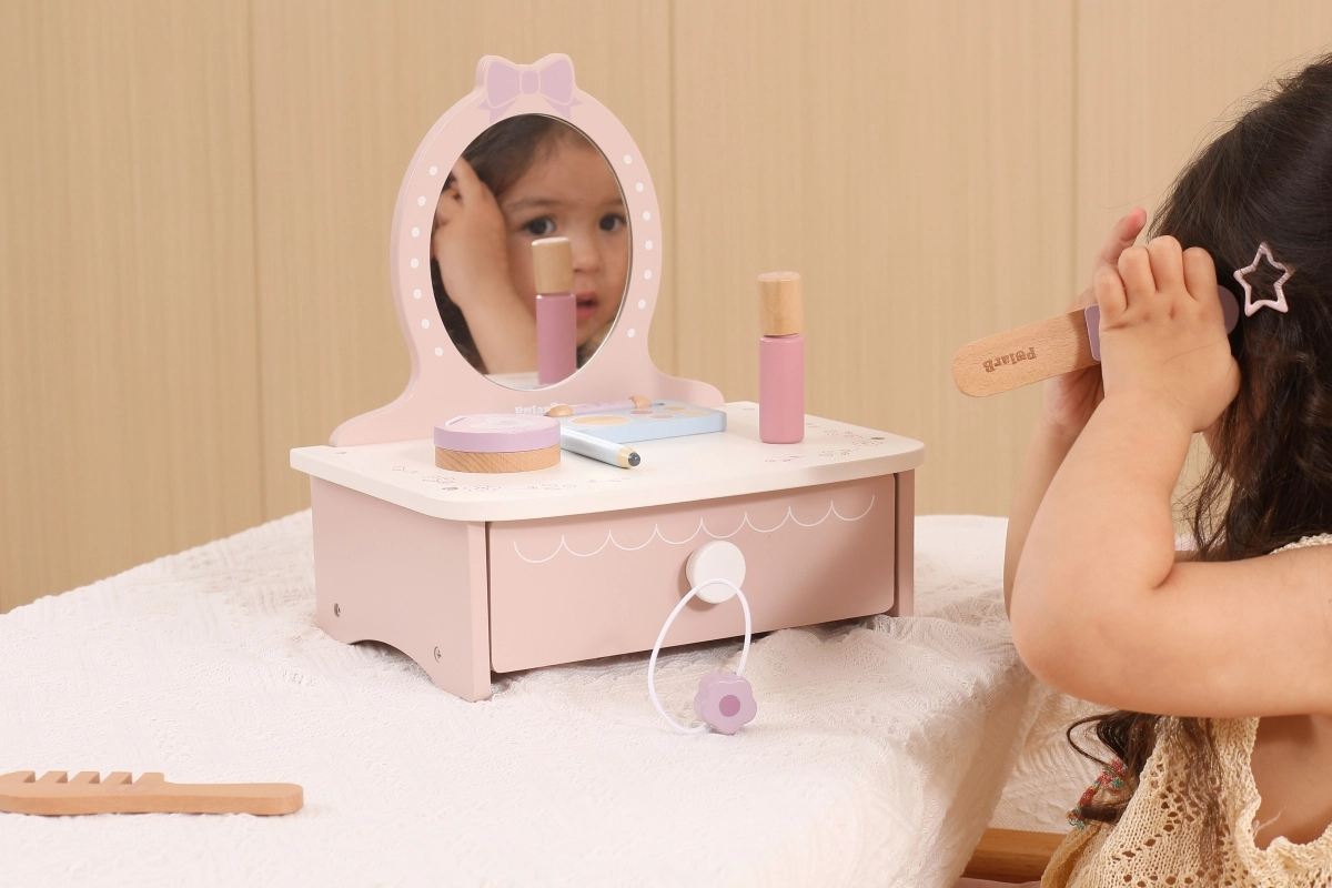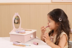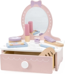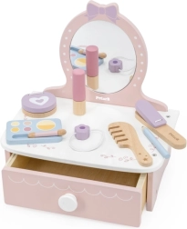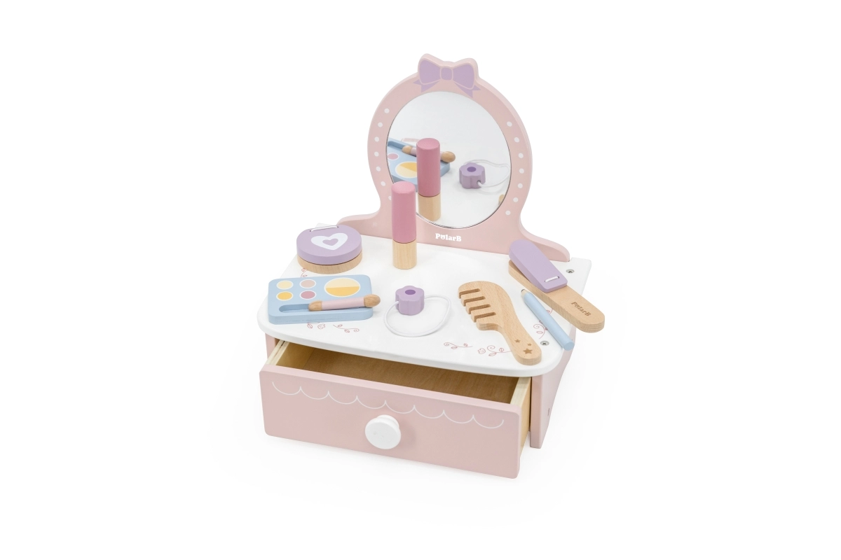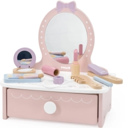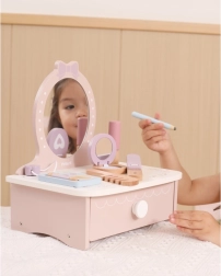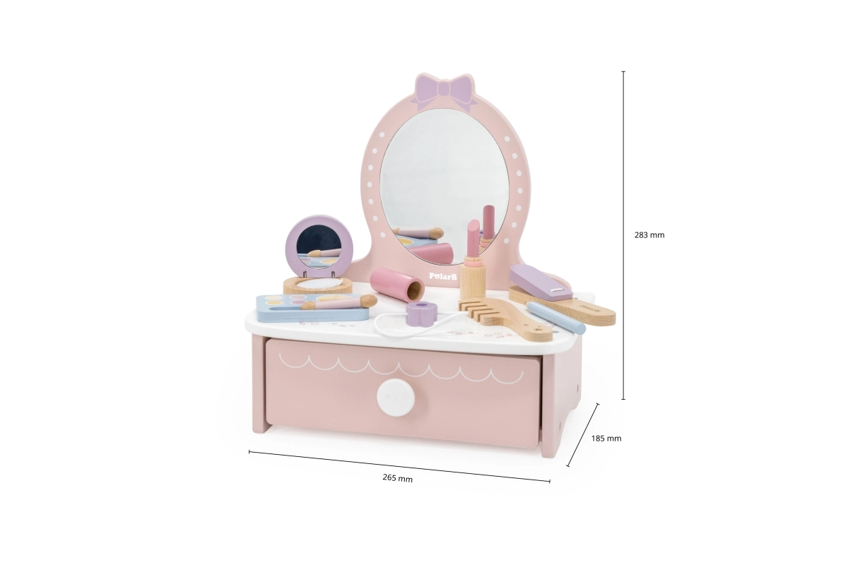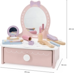 Στυλάτη παιδική ξύλινη τουαλέτα που προσφέρει ώρες δημιουργικής διασκέδασης. Περιλαμβάνει τραπεζάκι και ασφαλή ξύλινα αξεσουάρ όπως χτενάκι, ψαλίδι για μπούκλες και μακιγιάζ. Ιδανική για παιδιά από 3 ετών. Ανθεκτική ξύλινη κατασκευή, πλούσια αξεσουάρ και συμπαγείς διαστάσεις για εύκολη τοποθέτηση στο παιδικό δωμάτιο.