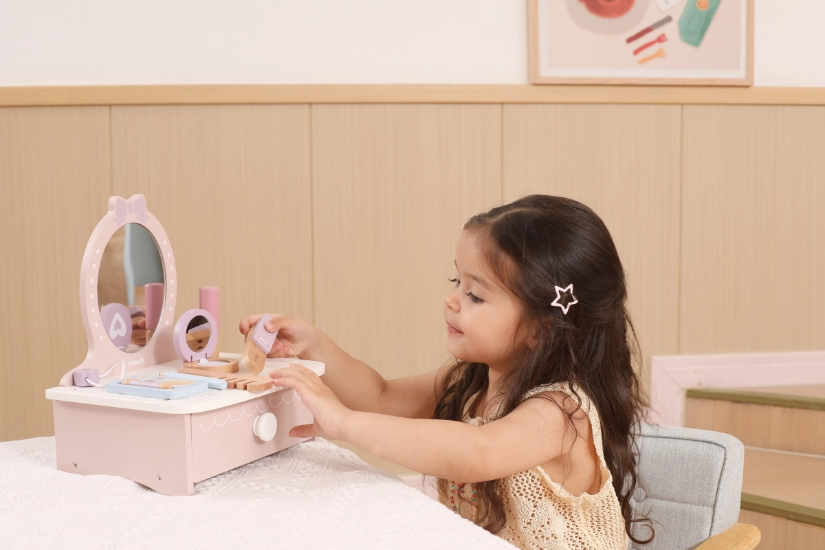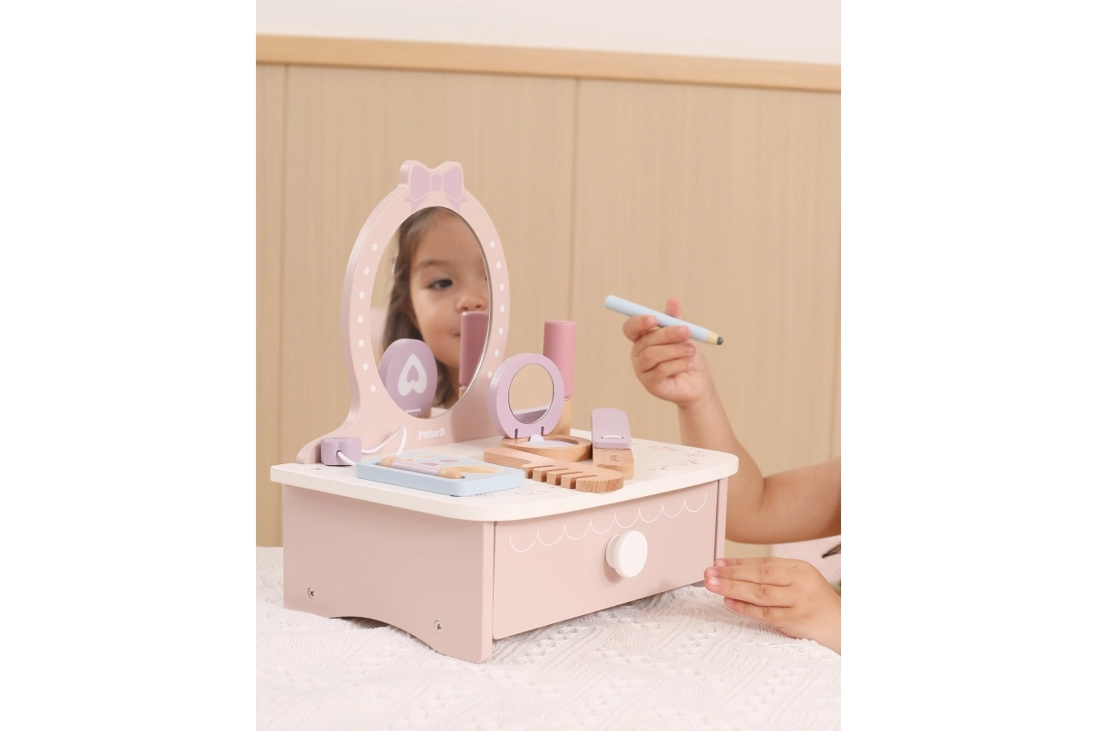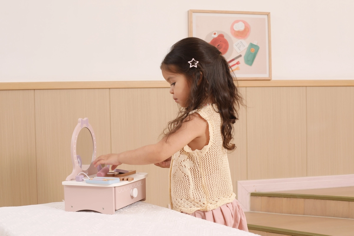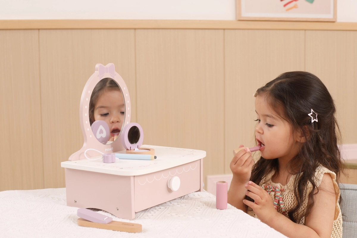 Στυλάτη παιδική ξύλινη τουαλέτα που προσφέρει ώρες δημιουργικής διασκέδασης. Περιλαμβάνει τραπεζάκι και ασφαλή ξύλινα αξεσουάρ όπως χτενάκι, ψαλίδι για μπούκλες και μακιγιάζ. Ιδανική για παιδιά από 3 ετών. Ανθεκτική ξύλινη κατασκευή, πλούσια αξεσουάρ και συμπαγείς διαστάσεις για εύκολη τοποθέτηση στο παιδικό δωμάτιο.
