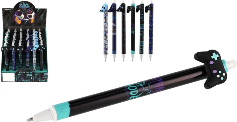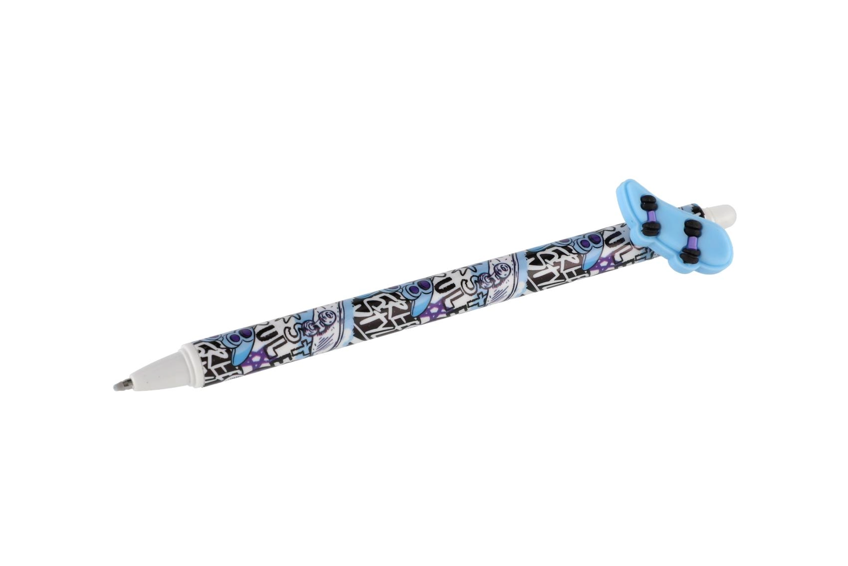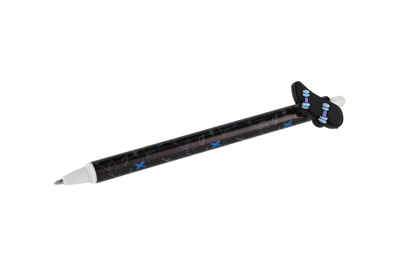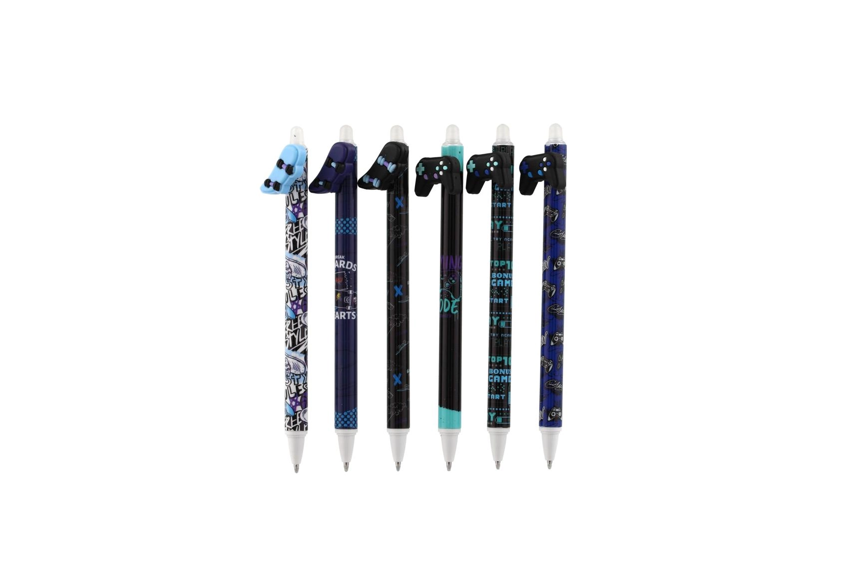Κάθε στυλό έχει πρωτότυπο topper σε σχήμα χειριστηρίου, σκέιτμπορντ, παπιγιόν ή φτερών και διακοσμείται με μοντέρνα μοτίβα σε παλέτα μαύρου και μπλε. Χάρη στο γομώσιμο μελάνι διορθώνεις εύκολα μικρά λάθη χωρίς μουτζούρες.