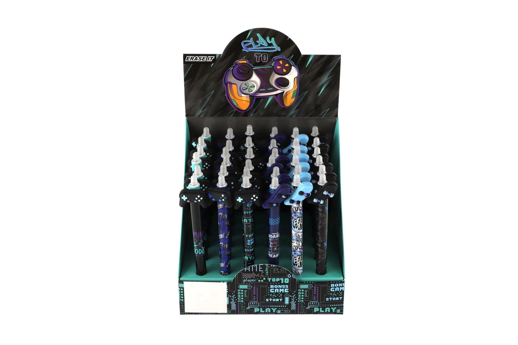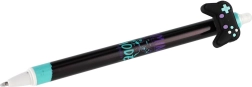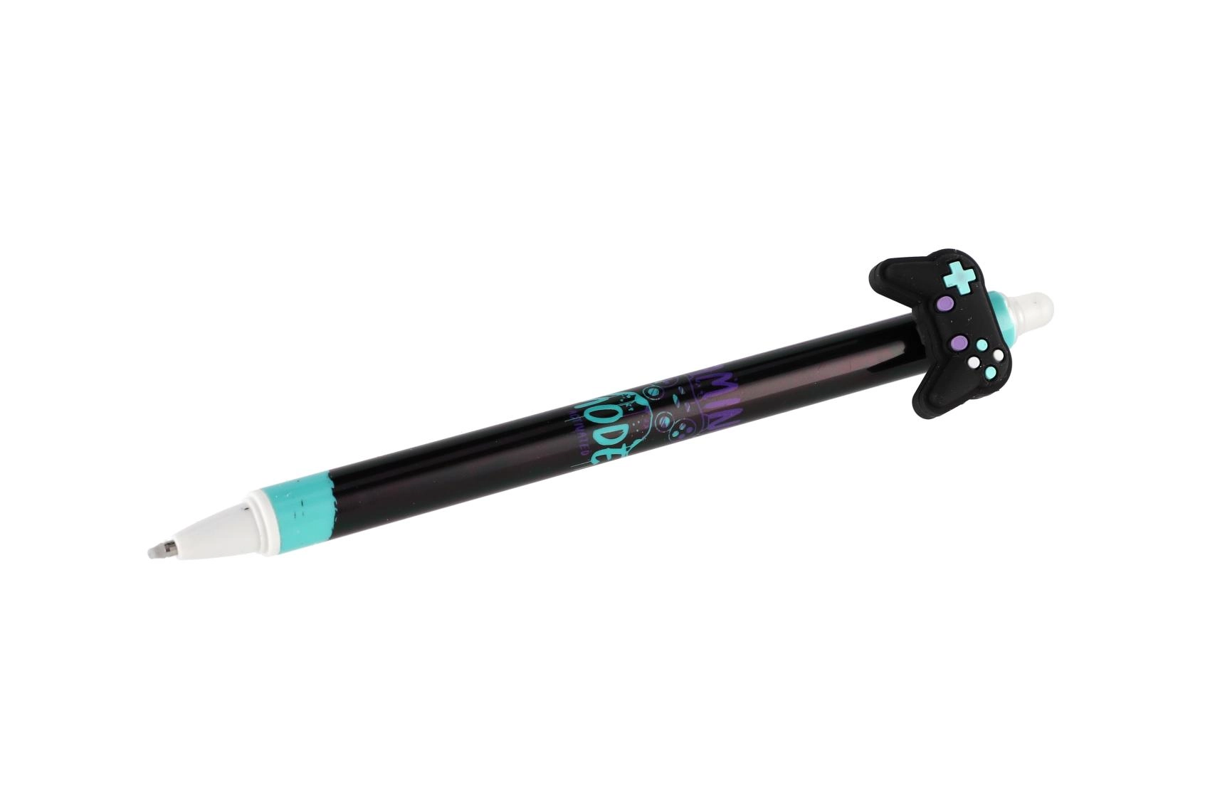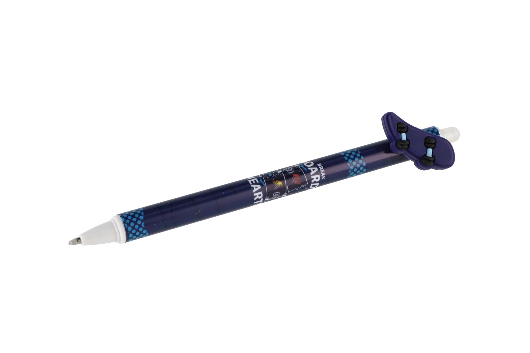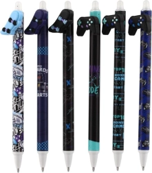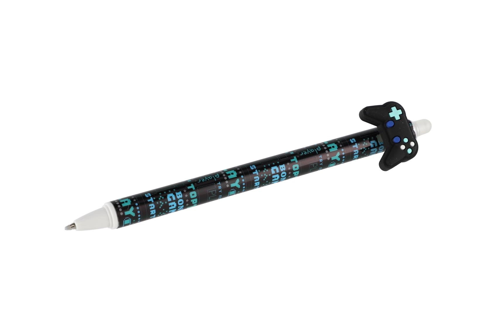 Κάθε στυλό έχει πρωτότυπο topper σε σχήμα χειριστηρίου, σκέιτμπορντ, παπιγιόν ή φτερών και διακοσμείται με μοντέρνα μοτίβα σε παλέτα μαύρου και μπλε. Χάρη στο γομώσιμο μελάνι διορθώνεις εύκολα μικρά λάθη χωρίς μουτζούρες.