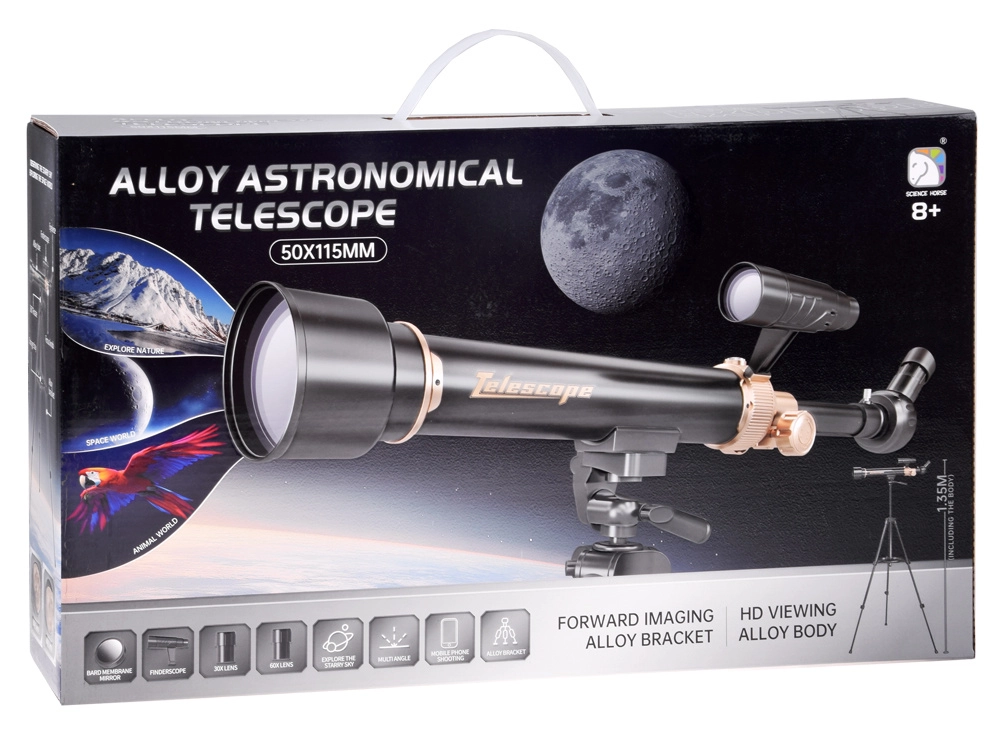Ξεκινήστε την εξερεύνηση του σύμπαντος με αυτό το ευέλικτο αστρονομικό τηλεσκόπιο. Προσφέρει μεγέθυνση 30x και 60x, εστιακή απόσταση 500 mm και σταθερό αλουμινένιο τρίποδο 1,3 m. Στη συσκευασία θα βρείτε ένα πλήρες σετ αξεσουάρ συμπεριλαμβανομένων προσοφθαλμίων, σκοπεύτρου, ζενίθιου καθρέφτη και βάσης για τηλέφωνο. Περιλαμβάνεται επίσης ειδικό μεμβρανώδες φίλτρο για ασφαλή παρατήρηση του Ήλιου.