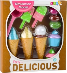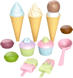 Ένα πολύχρωμο σετ παγωτών και γλυκών που θα ενθουσιάσει όλους τους μικρούς ζαχαροπλάστες. Περιλαμβάνει χωνάκια, παγωτά ξυλάκι, κεκάκια (cupcakes), μακαρόν και σκουπ παγωτού – όλα από ασφαλές πλαστικό. Υποστηρίζει την δημιουργικότητα, τη λεπτή κινητικότητα και το παιχνίδι ρόλων σε ζαχαροπλαστείο ή παγωτατζίδικο.