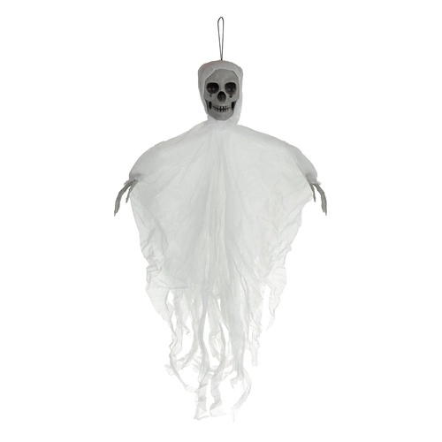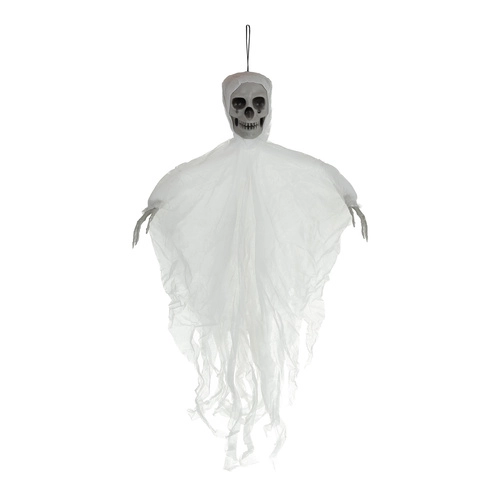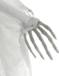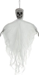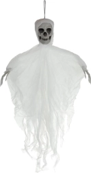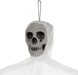Ρεαλιστικός κρεμαστός σκελετός με κρανίο και σκισμένο ύφασμα που δημιουργεί αμέσως τρομακτική ατμόσφαιρα. Ελαφριά κατασκευή και κρίκος ανάρτησης για εύκολη τοποθέτηση σε ταβάνι, πόρτες ή πολυέλαιο, καθώς και σε καλυμμένους εξωτερικούς χώρους. Το κινούμενο ύφασμα δημιουργεί εφέ αιωρούμενου φαντάσματος και οι μεγαλύτερες διαστάσεις 70 cm εξασφαλίζουν ότι θα τραβήξει όλα τα βλέμματα. Ιδανικό για Halloween, θεματικά πάρτι και σκηνογραφία.