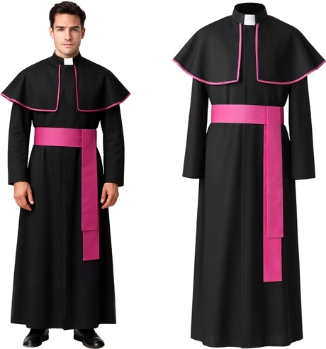 Κλασικό κοστούμι κληρικού με μακριά ράσο, πελέρι με γιακά και μωβ ζώνη, ένα έτοιμο μεταμφίεσμα ιδανικό για το Halloween, αποκριάτικα, cosplay και θεατρικές παραστάσεις. Άνετη γραμμή σε καθολικό μέγεθος XL/XXL για ευκολία και άνετο ντύσιμο, ενώ η ρεαλιστική εμφάνιση τραβά την προσοχή σε κάθε εκδήλωση.