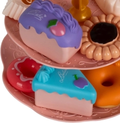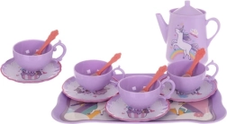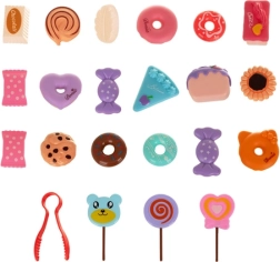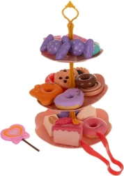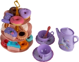 Περιεχόμενα συσκευασίας: βαλιτσάκι με χερούλι και μεταλλικό κλείσιμο, τριώροφη βάση για γλυκίσματα, τσαγιέρα με καπάκι, 4 φλιτζάνια, 4 πιατάκια, 4 διακοσμητικά κουταλάκια, μικρή λαβίδα, δίσκος σερβιρίσματος, 21 λιχουδιές (καραμέλες, ντόνατ, μακαρόν, μπισκότα), οδηγίες χρήσης, καφέ μεταφορικό κουτί.