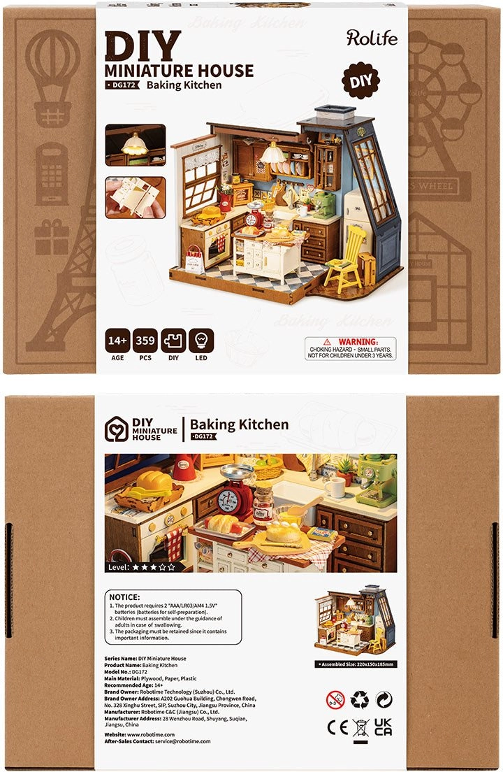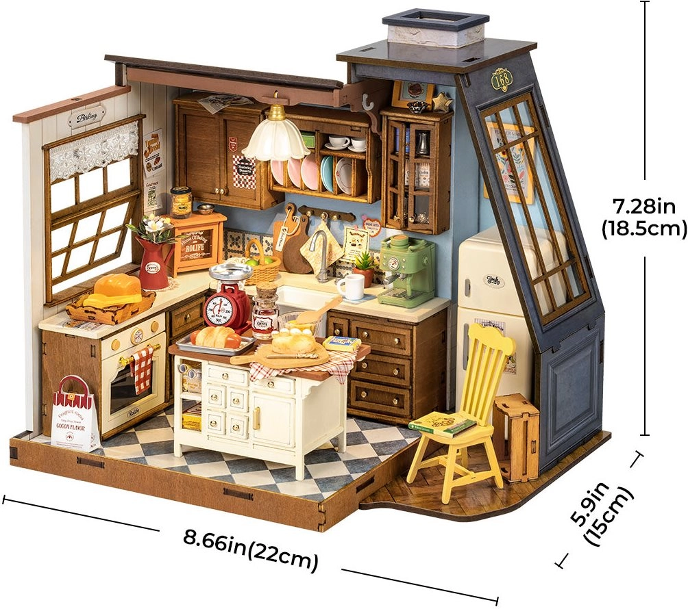 Αυτό το λεπτομερώς σχεδιασμένο μινιατούρικο σπιτάκι φέρνει την ατμόσφαιρα μιας καλής παλιάς κουζίνας. Θα βρείτε εντοιχισμένα ξύλινα ντουλάπια, μια παλιά ζυγαριά, καφετιέρα, λαμπερούς λευκούς πάγκους εργασίας και μια ρετρό κίτρινη καρέκλα. Τα μεγάλα παράθυρα – το ένα με ευρωπαϊκού τύπου λοξή υάλωση και το άλλο με σκεπή και κουρτίνα – χαρίζουν στη σκηνή φως και γοητεία. Ο LED φωτισμός αναδεικνύει επιπλέον τον ζεστό, σπιτικό χαρακτήρα.