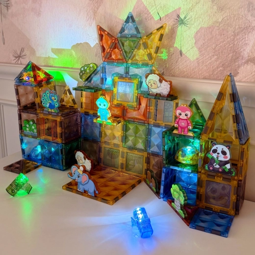 Το μαγνητικό σετ Woopie 3D Κόσμος των Ζώων προσφέρει 124 κομμάτια για ατελείωτες κατασκευές – από μάντρες και περιφράξεις έως ολόκληρα βασίλεια ζώων. Τα φωτιζόμενα στοιχεία δίνουν σε κάθε μοντέλο εντυπωσιακό αποτέλεσμα και μετατρέπουν το παιχνίδι σε βραδινή περιπέτεια. Οι δυνατοί μαγνήτες εξασφαλίζουν σταθερότητα και εύκολη σύνδεση ακόμη και για μικρότερα παιδιά.