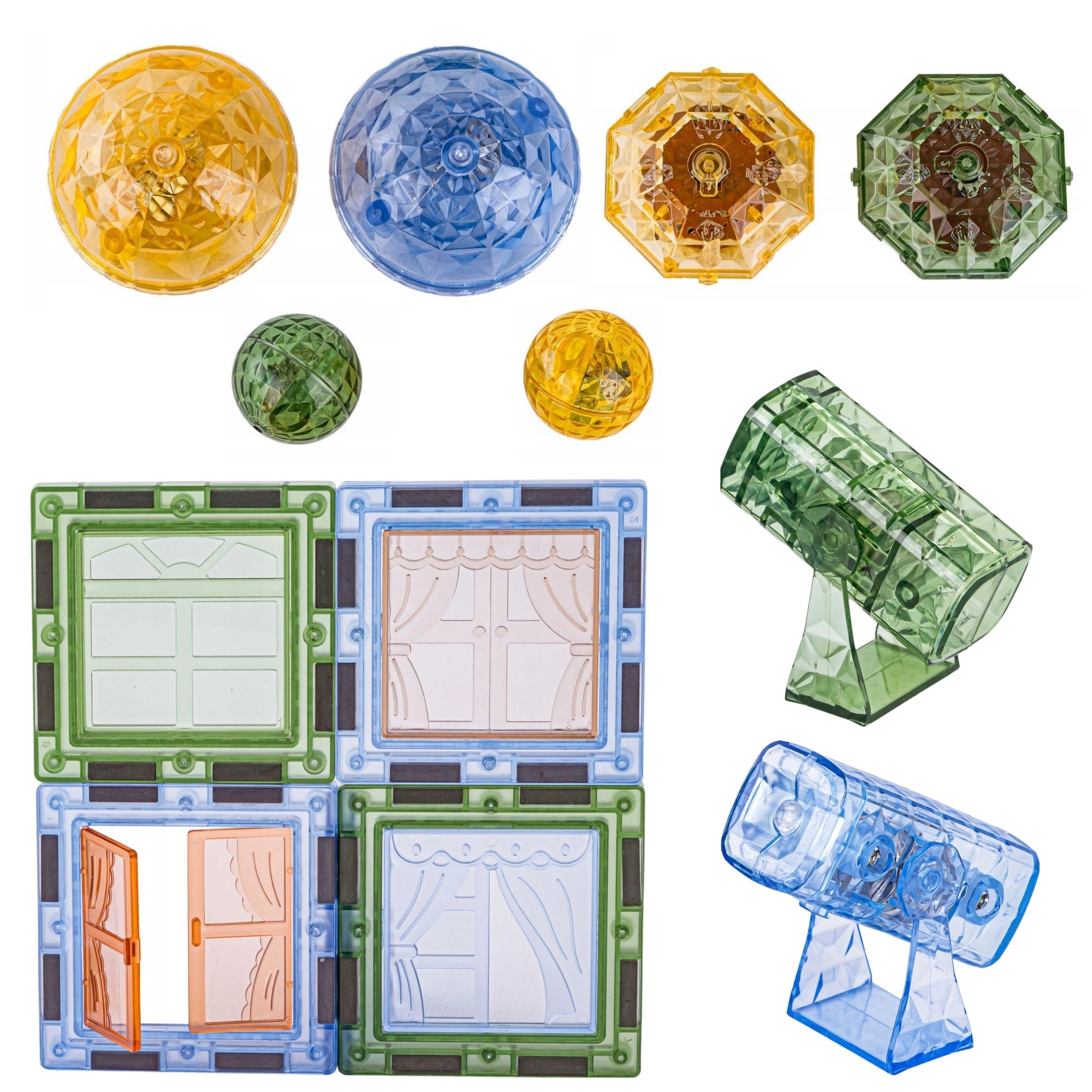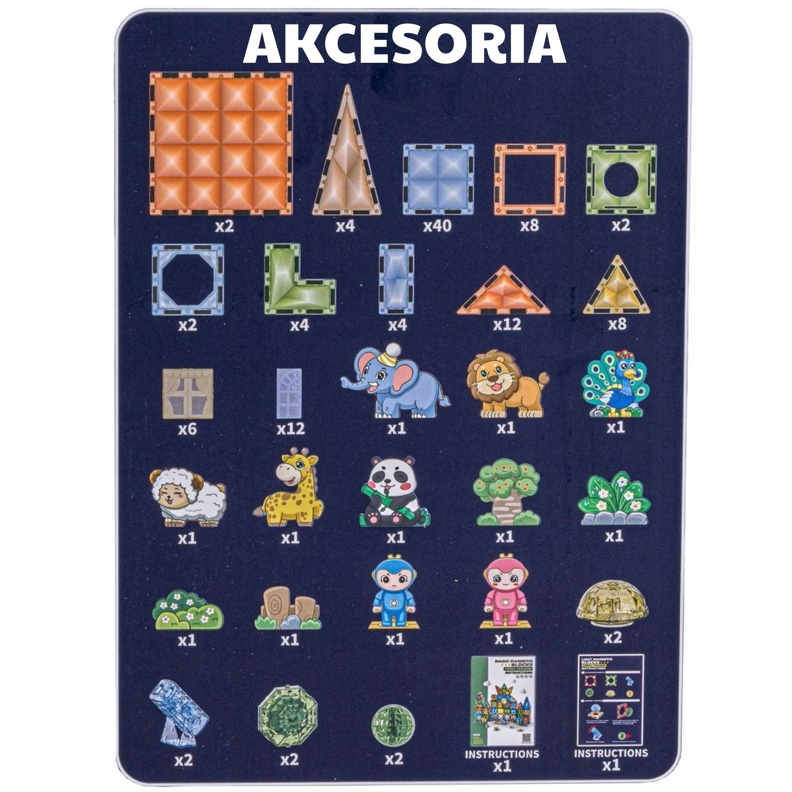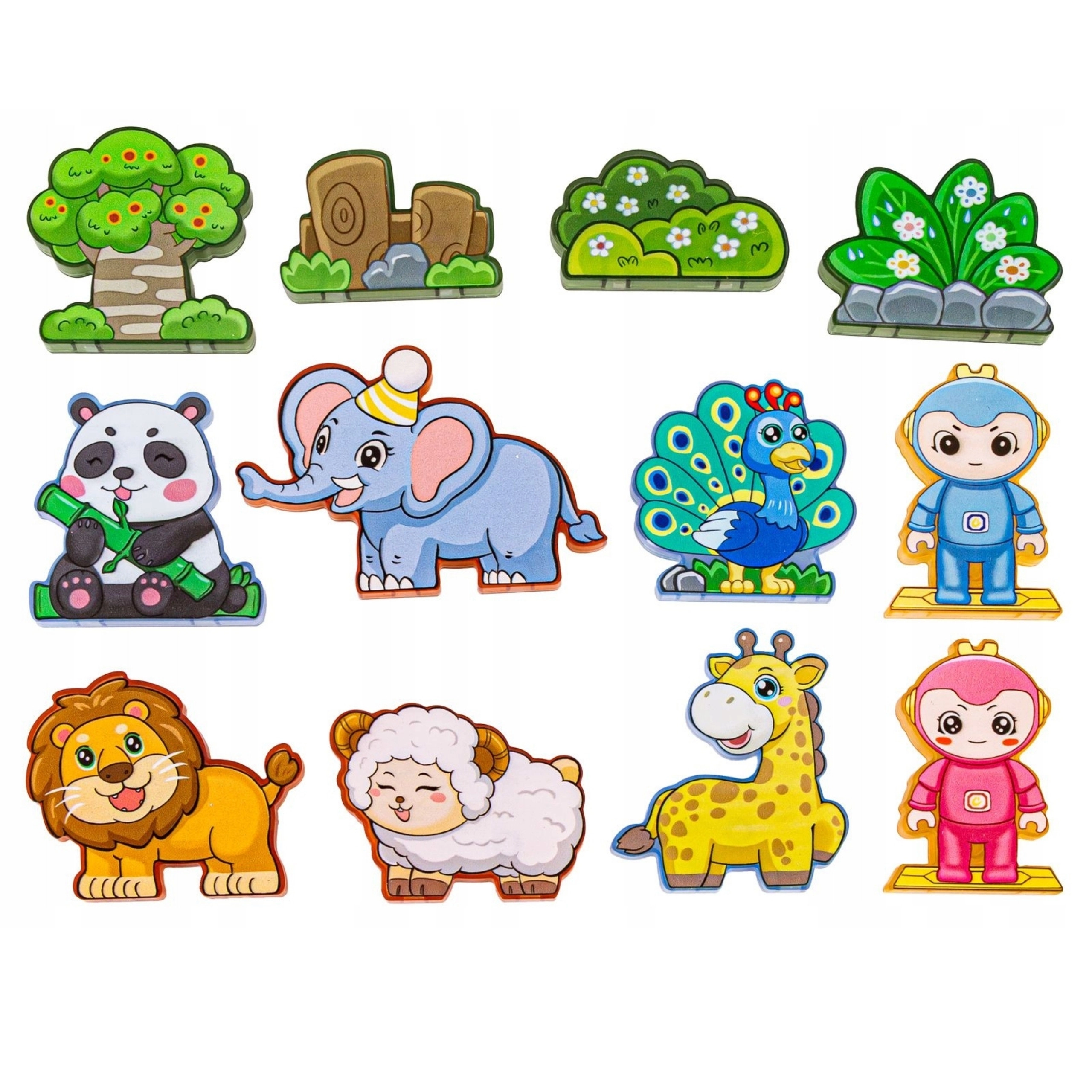 - Ποικιλία κομματιών: μαγνητικά σχήματα, φιγούρες ζώων και χαρακτήρων, θεματικά αξεσουάρ (δέντρο, βράχοι).