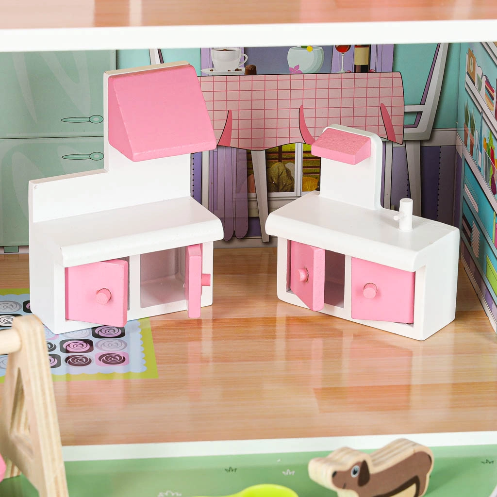 Ο πλούσιος εξοπλισμός περιλαμβάνει τραπέζι, 2 καρέκλες, κούνια, τουαλέτα, ξαπλώστρα, παγκάκι, παιδικό κρεβατάκι, λάμπα, μπολ για το σκυλάκι, ντουλάπα, κουζίνα/εστία και νιπτήρα καθώς και μια χαριτωμένη φιγούρα σκυλάκι. Χάρη στη στιβαρή κατασκευή από MDF, τα πλαστικά αξεσουάρ και τις μεταλλικές βίδες, το σπίτι είναι σταθερό και ανθεκτικό στην καθημερινή χρήση.