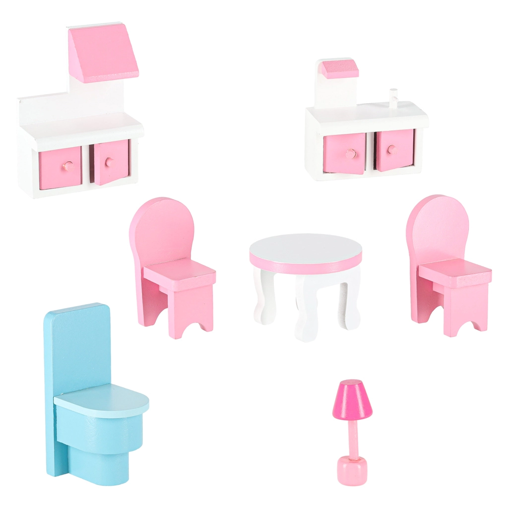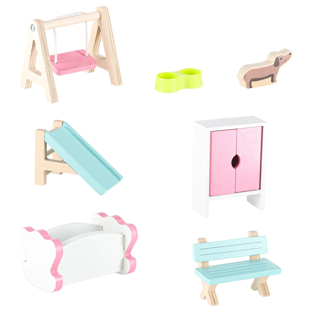 Τραπέζι, καρέκλες, κρεβατάκι, ντουλάπα, κουζινάκι, εξοπλισμός μπάνιου, κούνια, παγκάκι και φιγούρα σκυλάκι – όλα έτοιμα για άμεσο παιχνίδι.