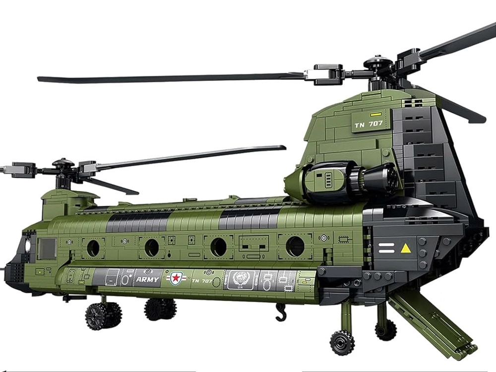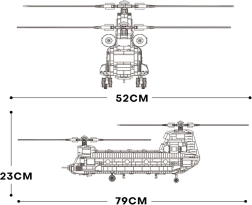 Συναρμολογήστε τον θρυλικό CH-47 CHINOOK από 1451 κομμάτια και απολαύστε ρεαλιστικές λεπτομέρειες όπως διπλούς στροφείς, ανοιγόμενη ράμπα και πόρτες και λεπτομερή άτρακτο. Το μεγάλο μοντέλο (περ. 79 × 52 × 23 cm) προσφέρει εξαιρετική εμπειρία κατασκευής, είναι συμβατό με δημοφιλείς μάρκες τουβλακίων και ξεχωρίζει σε κάθε συλλογή.