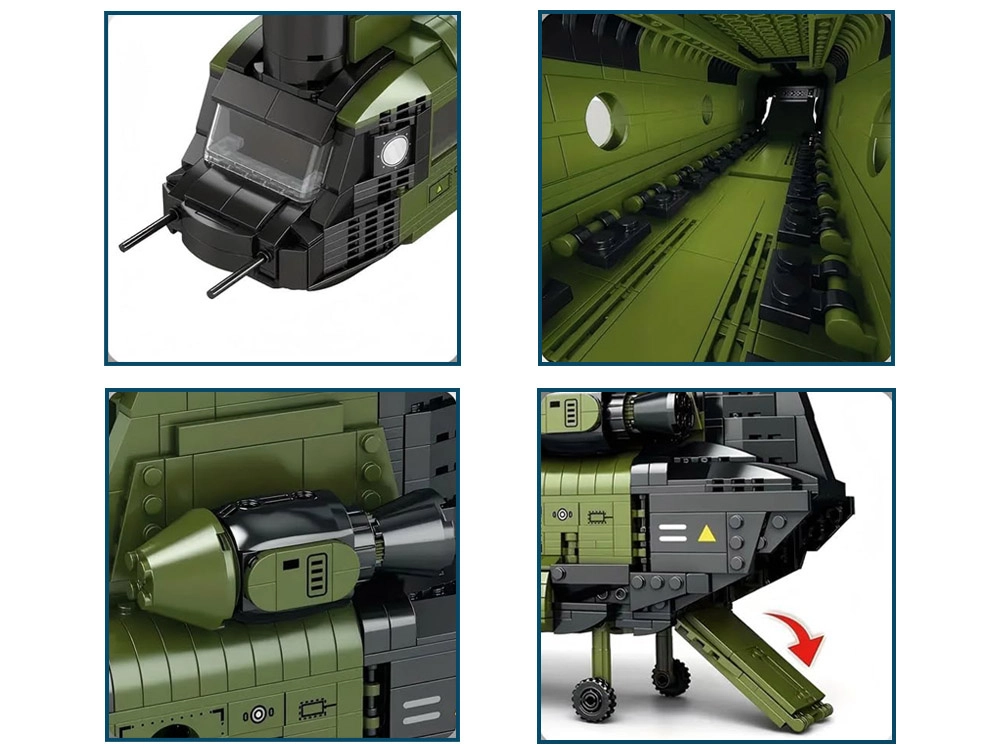 Αυτό το λεπτομερές μοντέλο μεταφορικού ελικοπτέρου CH-47 CHINOOK από τη Reobrix θα ενθουσιάσει φίλους της αεροπορίας, της τεχνολογίας και των στρατιωτικών θεμάτων. Η έμφαση στις ρεαλιστικές λειτουργίες – από τους πλήρως περιστρεφόμενους στροφείς σε διάταξη tandem μέχρι την ανοιγόμενη φορτωτική ράμπα και τους προσεγμένους εσωτερικούς χώρους – κάνει το σετ ιδανική επιλογή για κατασκευαστές από 14 ετών.