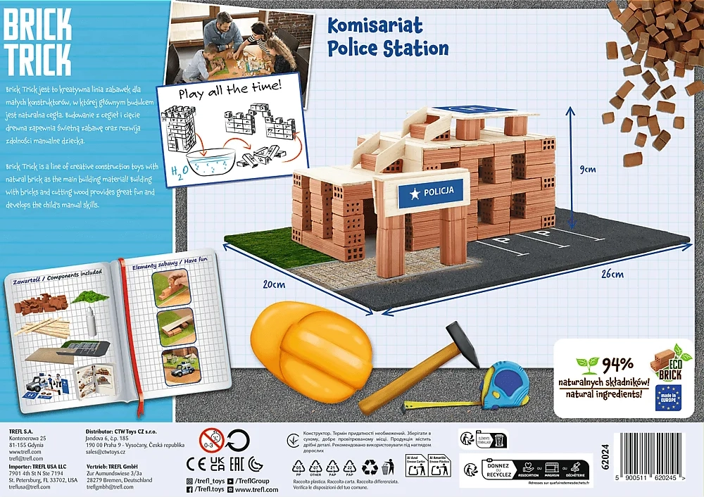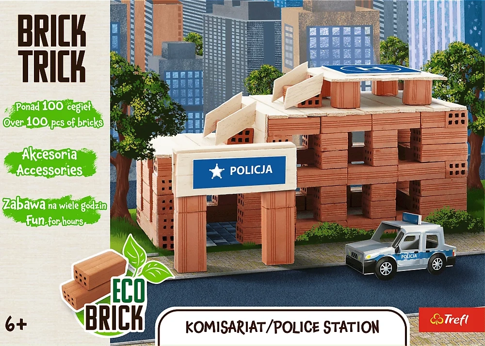 Ανακαλύψτε το δημιουργικό σετ κατασκευής Trefl Brick Trick Αστυνομικός Σταθμός με 100 αληθινά πήλινα τούβλα και διακοσμήσεις. Παιδιά και ενήλικες θα απολαύσουν ρεαλιστική κατασκευή βήμα προς βήμα – από τη βάση, στα ξύλινα καδρόνια, έως τον τελικό στολισμό. Το σετ αναπτύσσει δεξιοτεχνία, φαντασία και συγκέντρωση και μπορεί να χρησιμοποιηθεί ξανά και ξανά χάρη στην κόλλα που διαλύεται στο νερό.
