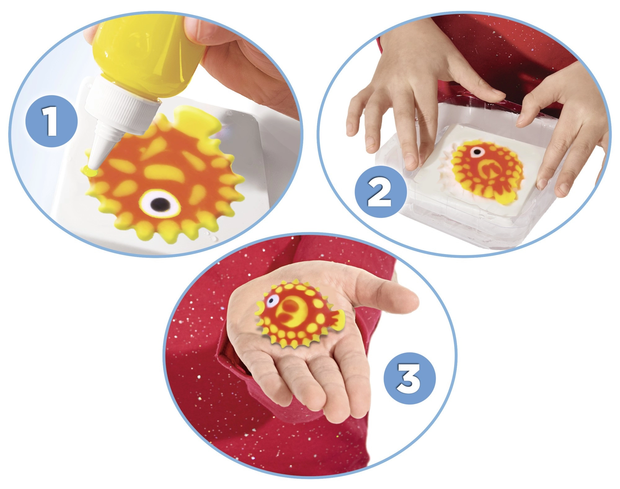Αναμείξτε το διάλυμα, γεμίστε το καλούπι με τζελ και βυθίστε το στο νερό – σε μια στιγμή δημιουργείται μια απαλή 3D φιγούρα έτοιμη για παιχνίδι.