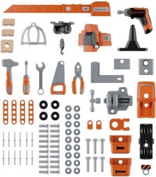 Περιλαμβάνεται κιτ κατασκευής αυτοκινήτου που οι μικροί μηχανικοί συναρμολογούν σε λίγα βήματα. Το εργαστήριο περιέχει σφυράκι, κλειδί τροχών, κατσαβίδι, γαλλικό/ανοιχτό κλειδί, πένσα, πριόνι, μεγάλη μέγγενη και παχύμετρο/χάρακα, καθώς και βίδες, παξιμάδια, πρόκες και συνδετικό υλικό. Συμβατό και επεκτάσιμο με όλα τα εργαλεία BLACK+DECKER της Smoby.