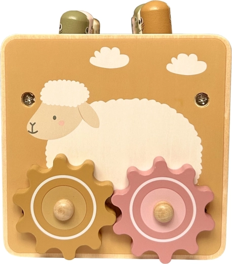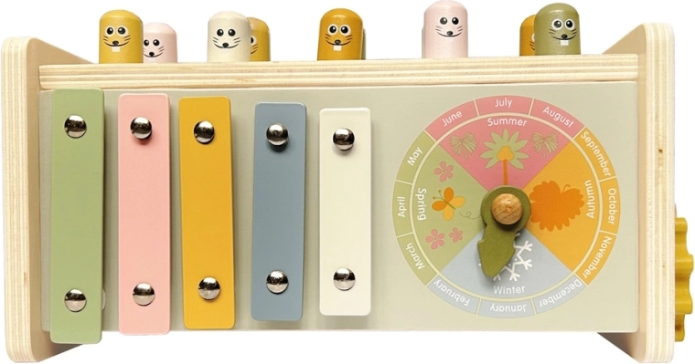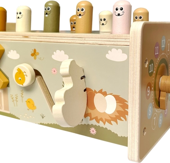 Αυτό το πλούσια εξοπλισμένο ξύλινο πολυλειτουργικό παιχνίδι κεντρίζει το ενδιαφέρον των παιδιών με πολλές επιλογές παιχνιδιού και παράλληλα τα καθοδηγεί διακριτικά στην ανάπτυξη σημαντικών δεξιοτήτων. Τα παιδιά μπορούν να χτυπούν τους χαρούμενους τυφλοπόντικες με το ξύλινο σφυράκι, να ψαρεύουν μαγνητικά ψαράκια, να περιστρέφουν γρανάζια, να δοκιμάζουν τους δείκτες του ρολογιού και να εξερευνούν άλλα μηχανικά στοιχεία που ενισχύουν την κατανόηση της αιτίας και του αποτελέσματος.