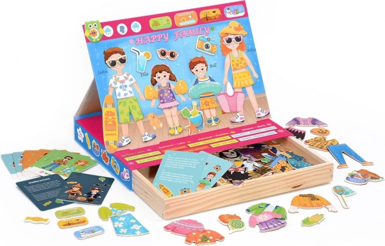 Το Μαγνητικό Ντύσιμο Οικογένεια είναι ένα δημιουργικό σετ όπου τα παιδιά σχεδιάζουν ρούχα για τη μαμά, τον μπαμπά, την κόρη και τον γιο. Χάρη στην πλούσια ποικιλία ρούχων και αξεσουάρ μπορούν να φτιάχνουν εμφανίσεις για καλοκαίρι, φθινόπωρο, χειμώνα και άνοιξη, και να ολοκληρώνουν διασκεδαστικές αποστολές από θεματικές καρτέλες. Το πρακτικό ξύλινο μαγνητικό κουτί με περιστρεφόμενο πίνακα λειτουργεί ως επιφάνεια παιχνιδιού και ως θήκη αποθήκευσης, ώστε το παιχνίδι να είναι έτοιμο να σας ακολουθήσει παντού.