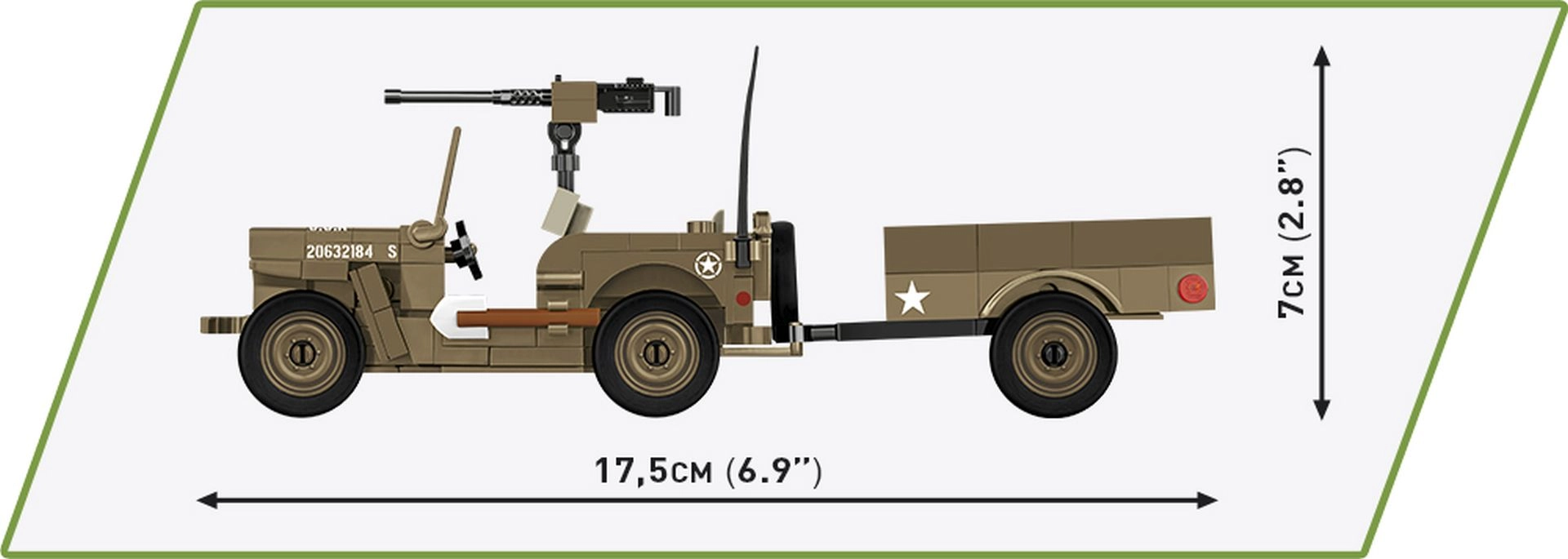 Ο θρυλικός εκτός δρόμου αυτοκινητάκι του Β΄ Παγκοσμίου Πολέμου ζωντανεύει στο σετ της COBI: Jeep WILLYS MB με ρυμουλκούμενο. Το μοντέλο ξεχωρίζει για τις αυθεντικές γραμμές, τον στρατιωτικό χρωματισμό και το πακέτο αξεσουάρ, συμπεριλαμβανομένου περιστρεφόμενου πολυβόλου, εργαλείων και όπλων για τις φιγούρες. Χάρη στα ποιοτικά τουβλάκια, το μοντέλο είναι σταθερό και κατάλληλο για έντονο παιχνίδι ή προβολή σε βιτρίνα.