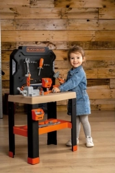 Το ρεαλιστικό παιδικό εργαστήριο Smoby Black+Decker Bricolo Center προσφέρει ένα μεγάλο, στιβαρό πάγκο εργασίας με 78 κομμάτια αξεσουάρ και 7 εργαλεία. Η φαρδιά επιφάνεια εργασίας σε σχέδιο ξύλου, η μέγγενη, ο συρόμενος κανόνας και οι πολλές αποθηκευτικές θήκες εξασφαλίζουν ώρες δημιουργικότητας και παιχνιδιού. Δεν λείπει η διασκεδαστική λειτουργία καρφώματος και η έμφαση στη βιωσιμότητα – το προϊόν περιέχει τουλάχιστον 75% ανακυκλωμένο υλικό.