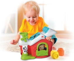 Τα παιδιά θα απολαύσουν και τα μηχανικά στοιχεία: η καμινάδα έχει λειτουργία «πίεσε και βγες», όπου το τουβλάκι γλιστρά προς τα έξω από πλευρικό άνοιγμα, και ο ανεμόμυλος περιστρέφεται ακόμη και με ελαφρύ άγγιγμα. Οι αισθητηριακές υφές στην επιφάνεια υποστηρίζουν την ανάπτυξη της αφής, ενώ η ταξινόμηση και ο χειρισμός των τουβλακίων αναπτύσσουν την οφθαλμοχειρική συντονισμό και τη λεπτή κινητικότητα. Το θεματικό αγροτικό περιβάλλον με φιγούρες ενθαρρύνει το δημιουργικό παιχνίδι και την αφήγηση δικών τους ιστοριών.