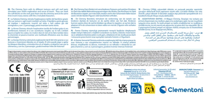 Αυτή η διαδραστική φάρμα της σειράς Clemmy προσφέρει ασφαλές και εποικοδομητικό παιχνίδι για νήπια. Στο εσωτερικό θα βρείτε πολλά μαλακά, εύκολα στο κράτημα τουβλάκια, που μπορούν να τοποθετηθούν στα παράθυρα ή από τη στέγη. Ένα τμήμα της στέγης έχει μαλακή ένθεση για εισαγωγή, ενώ το άλλο ανοίγει για εύκολη αφαίρεση των τουβλακίων.