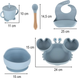 Πλήρες σετ σιλικόνης για τους μικρούς με χαριτωμένο πιάτο σε σχήμα καβουριού, μπολ, ποτηράκι με δύο καπάκια και καλαμάκι, μαχαιροπίρουνα και ρυθμιζόμενο σαλιάρα. Σιλικόνη χωρίς BPA, βεντούζες κατά της ανατροπής και εύκολο καθάρισμα κάνουν αυτό το σετ ιδανική επιλογή για τα πρώτα αυτόνομα γεύματα.
