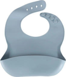 Μαλακή σιλικονούχα σαλιάρα με ρυθμιζόμενο κούμπωμα και φαρδιά τσέπη που συγκρατεί ψίχουλα και υγρά, κρατώντας τα ρούχα καθαρά.
