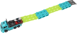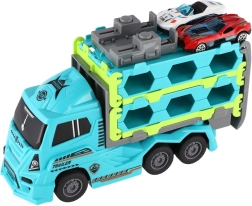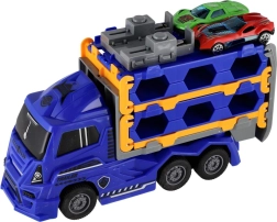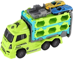 Αυτό το ανθεκτικό πλαστικό φορτηγό λειτουργεί ως μεταφορέας μικρών αγωνιστικών αυτοκινήτων και προσφέρει στα παιδιά άφθονη δράση. Χάρη στον μηχανισμό αδράνειας, μετά το τέντωμα κινείται μόνο του, ιδανικό για δυναμικό παιχνίδι στο χαλί ή σε λείο δάπεδο.