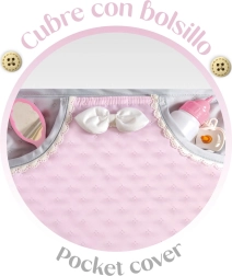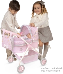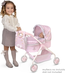 Ο πρακτικός εξοπλισμός περιλαμβάνει αποσπώμενη τσάντα για το καροτσάκι ή για το χέρι, κάλυμμα λίκνου με θηλάκια και μικρές τσέπες, άνετο στρώμα και κάτω αποθηκευτικό χώρο για μικροαντικείμενα. Ο ισπανικός σχεδιασμός και η προσεγμένη κατασκευή εξασφαλίζουν μεγάλη αντοχή και χαρά στο παιχνίδι κάθε μέρα.