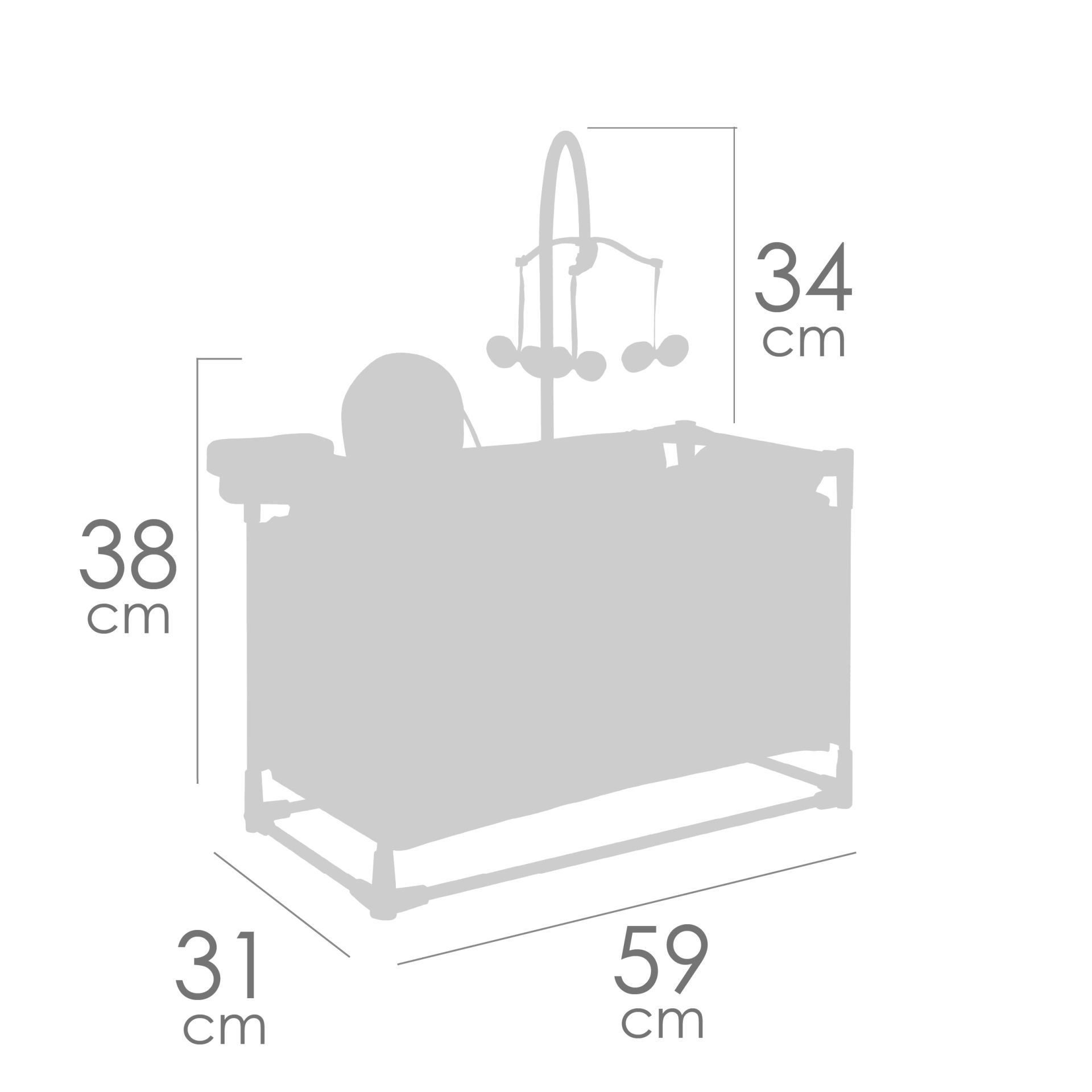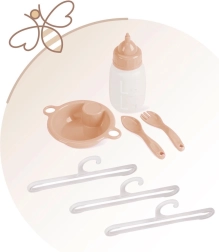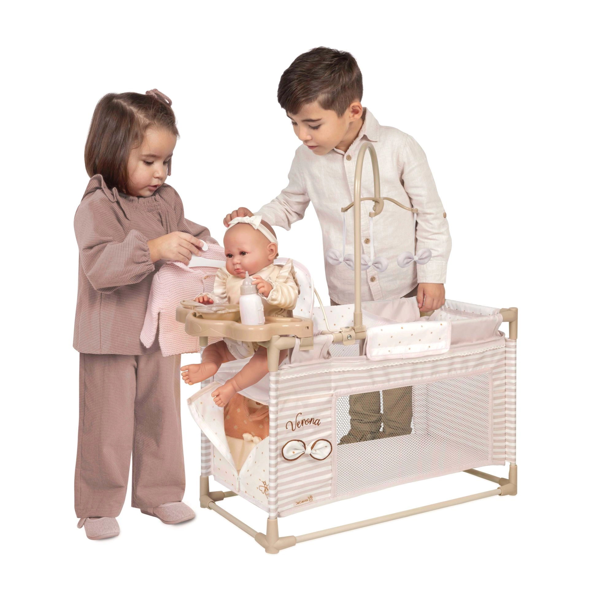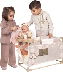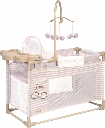 Περιλαμβάνονται όλα όσα χρειάζονται οι μικρές μαμάδες: μομπίλ για να απασχολείται η κούκλα, αλλαξιέρα για φροντίδα, καρεκλάκι φαγητού με μπουκάλι, μπολ και μαχαιροπίρουνα και πρακτική ντουλάπα με φερμουάρ και κρεμάστρες. Το τμήμα κρεβατιού με δικτυωτό παραθυράκι επιτρέπει στα παιδιά να έχουν συνεχώς την κούκλα στο οπτικό τους πεδίο, ενώ η ευρύχωρη βάση εξασφαλίζει άνεση στο παιχνίδι.