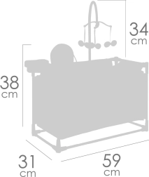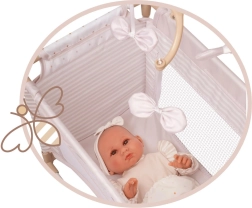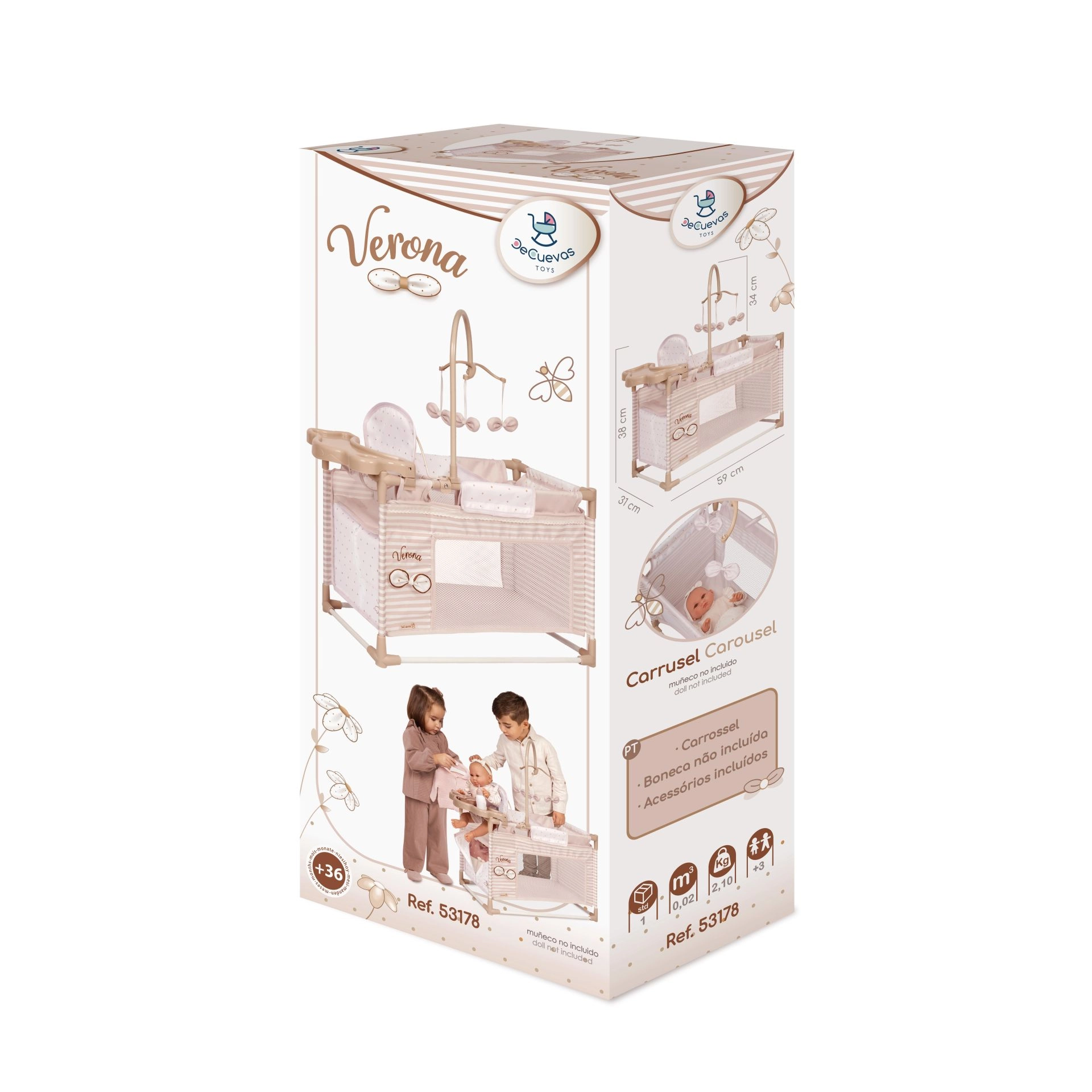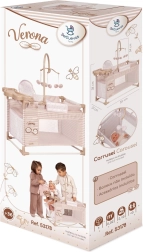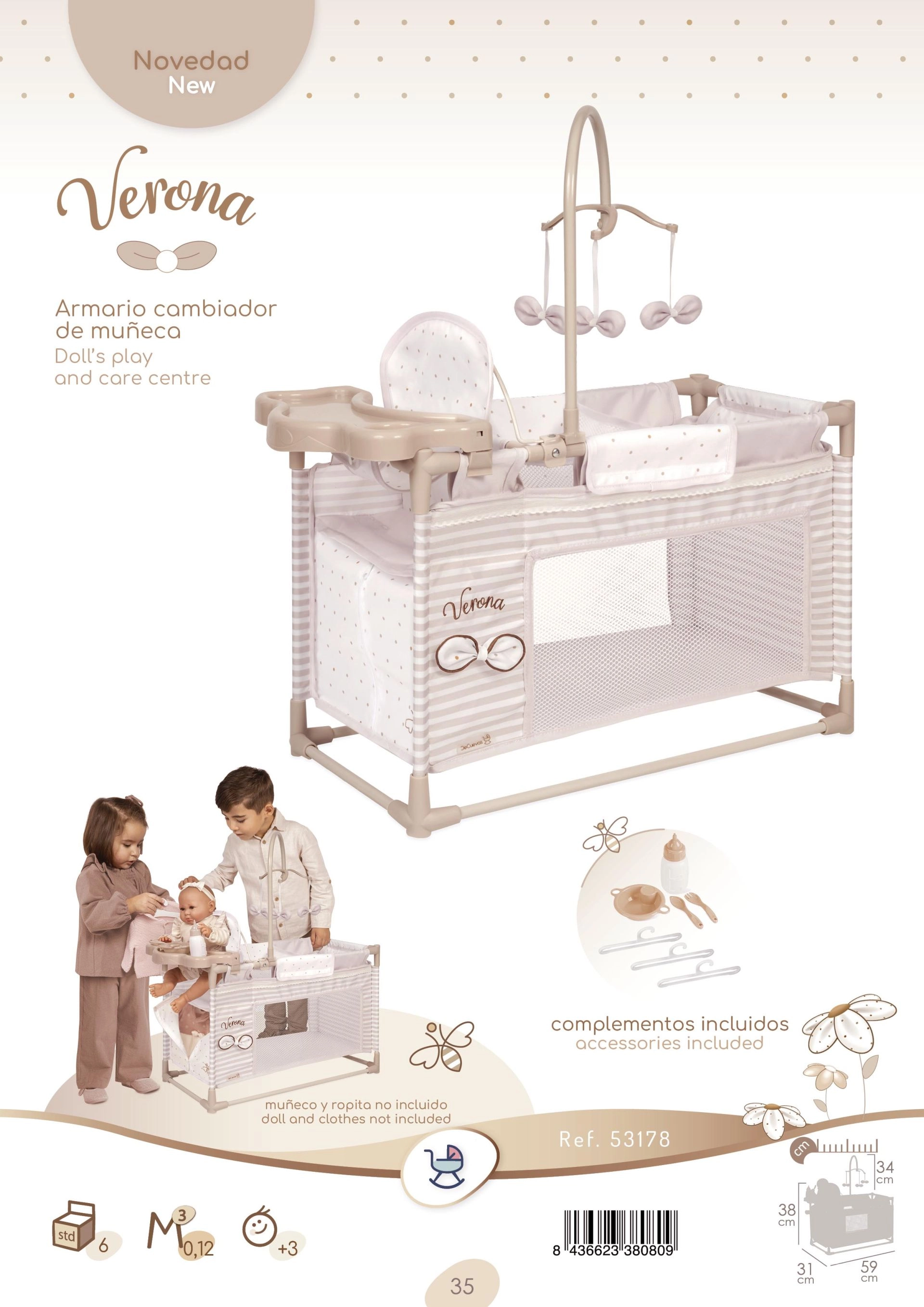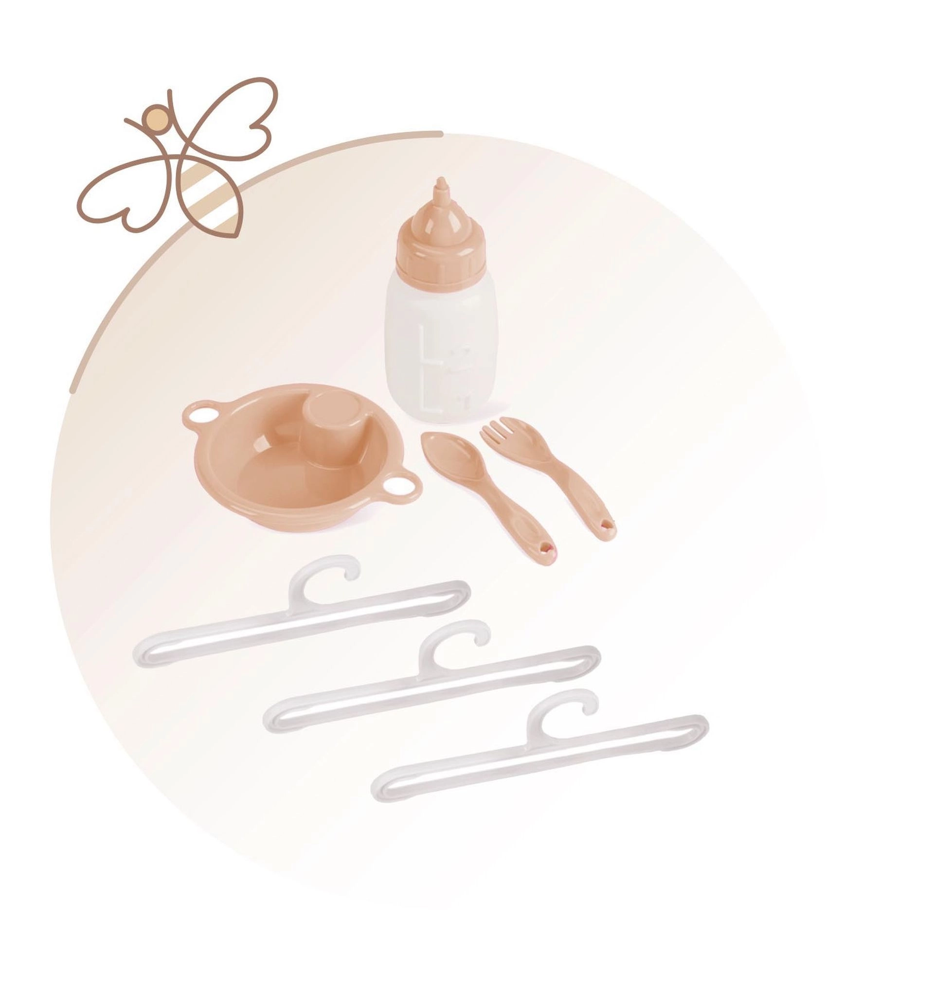 Περιλαμβάνονται όλα όσα χρειάζονται οι μικρές μαμάδες: μομπίλ για να απασχολείται η κούκλα, αλλαξιέρα για φροντίδα, καρεκλάκι φαγητού με μπουκάλι, μπολ και μαχαιροπίρουνα και πρακτική ντουλάπα με φερμουάρ και κρεμάστρες. Το τμήμα κρεβατιού με δικτυωτό παραθυράκι επιτρέπει στα παιδιά να έχουν συνεχώς την κούκλα στο οπτικό τους πεδίο, ενώ η ευρύχωρη βάση εξασφαλίζει άνεση στο παιχνίδι.