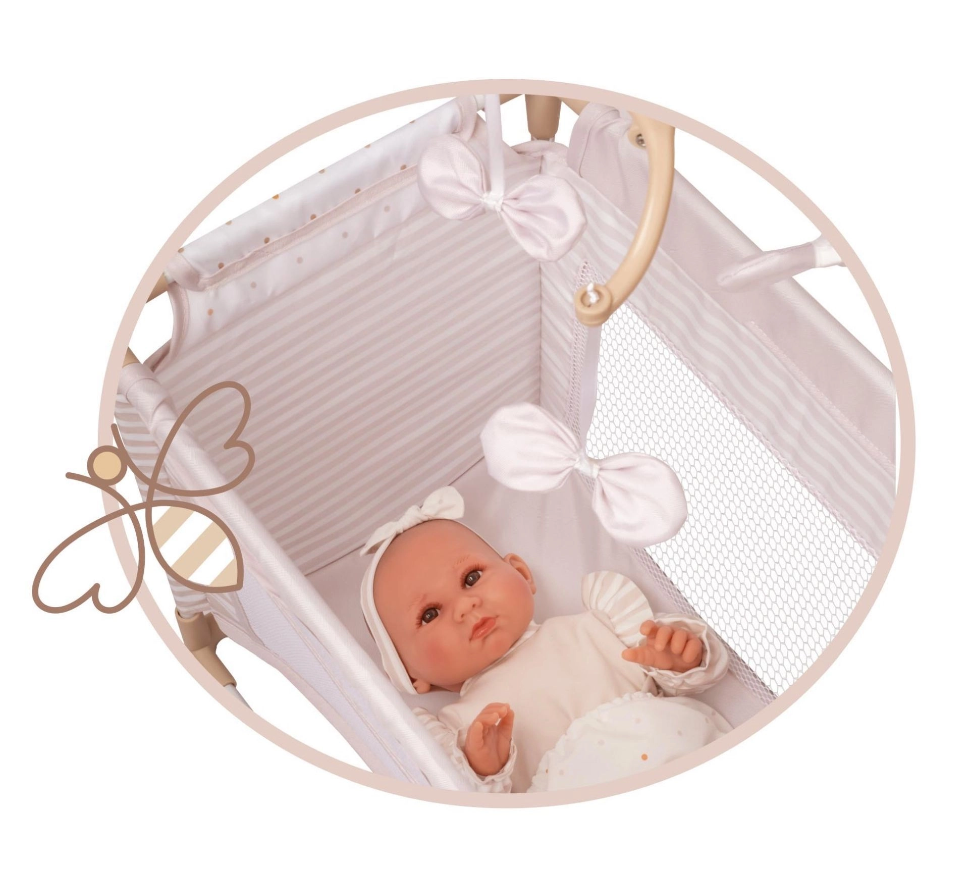 Αυτό το κομψό κρεβατάκι για κούκλες σε παστέλ τόνους μπεζ και λευκού ολοκληρώνει με στυλ κάθε παιδικό δωμάτιο. Συνδυάζει φυσική εμφάνιση με χαριτωμένες λεπτομέρειες, όπως πουά, ρίγες και διακριτικές κορδέλες που θυμίζουν πέταλα. Χάρη στην ποιοτική κατασκευή και τη σταθερή δομή, το παιχνίδι είναι ασφαλές και άνετο.