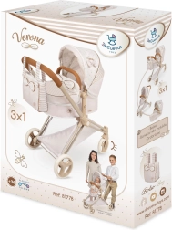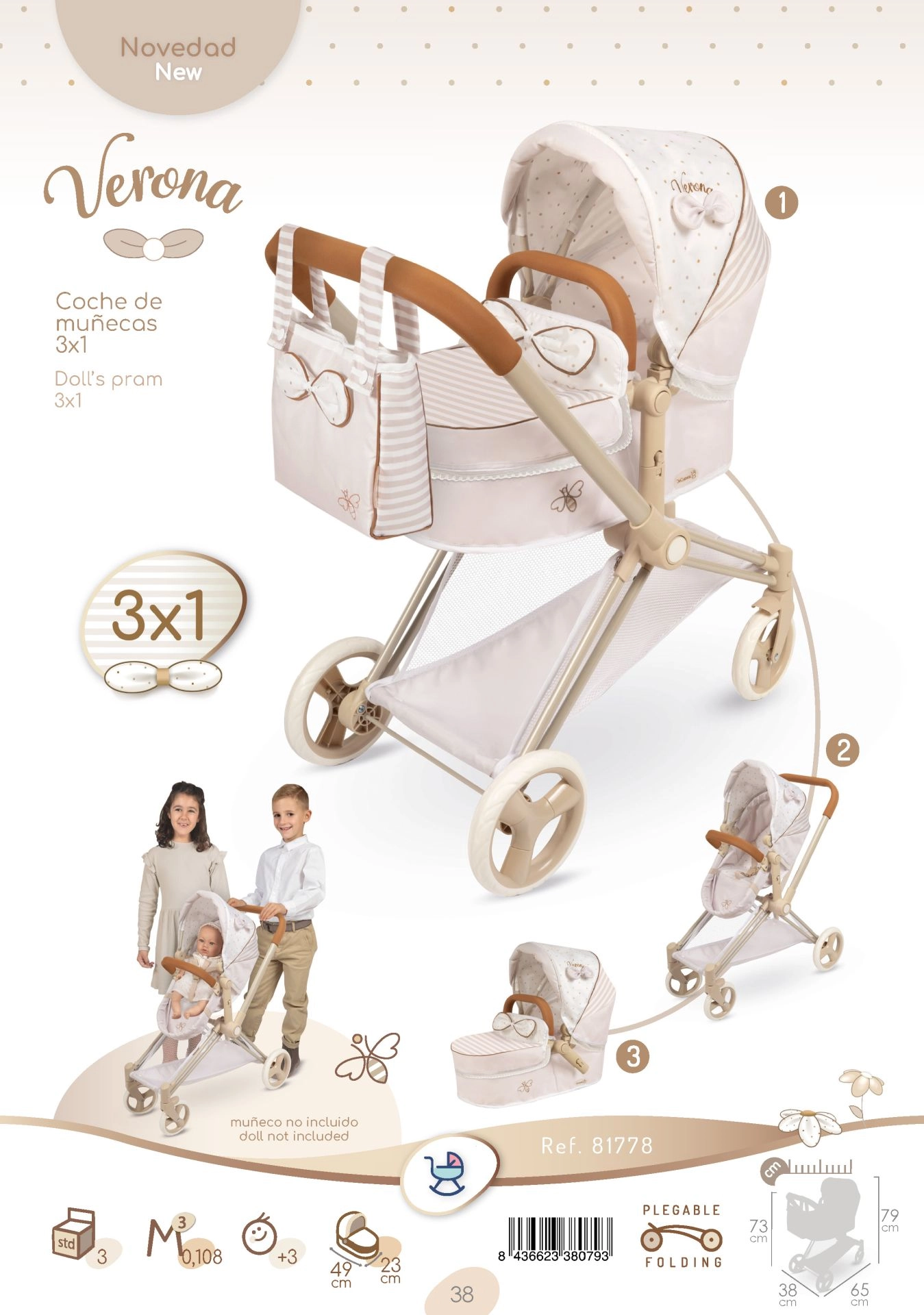 Ένα κομψό παιδικό καρότσι για κούκλες 3 σε 1 από τη συλλογή VERONA, που εντυπωσιάζει με τον απαλό φυσικό σχεδιασμό, την πτυσσόμενη κατασκευή και την αφαιρούμενη βαθιά καλαθούνα που μετατρέπεται σε σπορ έκδοση. Διαθέτει ρυθμιζόμενη κουκούλα, τρίποντη ζώνη, περιστρεφόμενους μπροστινούς τροχούς για εύκολο χειρισμό και πρακτική τσάντα καθώς και κάτωθι αποθηκευτικό καλάθι. Ιδανική επιλογή για παιδιά από 3 ετών.