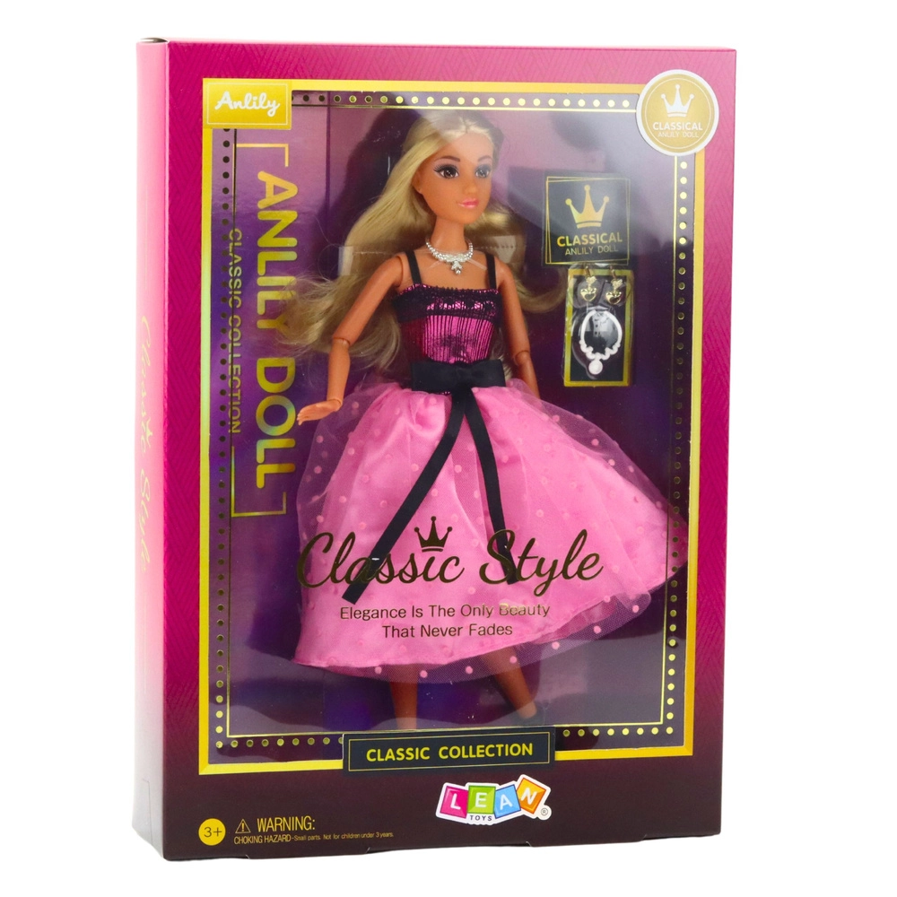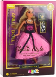Η κομψή κούκλα ANLILY με ροζ‑μαύρο βραδινό φόρεμα θα χαροποιήσει κάθε μικρή λάτρη της μόδας. Έχει μακριά ξανθά μαλλιά για δημιουργία χτενισμάτων, κινούμενα άκρα για ρεαλιστικό παιχνίδι και πλούσια αξεσουάρ – κολιέ, σκουλαρίκια και μαύρα παπούτσια. Ιδανική για δημιουργικό παιχνίδι και στιλάτες ιστορίες.
