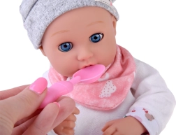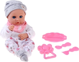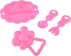 Συμπεριλαμβάνεται πρακτικό σετ ταΐσματος σε ροζ χρώμα – πιατάκι, κουταλάκι και πιρουνάκι – καθώς και κουδουνίστρα. Τα παιδιά μπορούν έτσι να απολαύσουν παιχνίδια ρόλων, αναπτύσσοντας φαντασία, λεπτή κινητικότητα και κοινωνικές δεξιότητες.