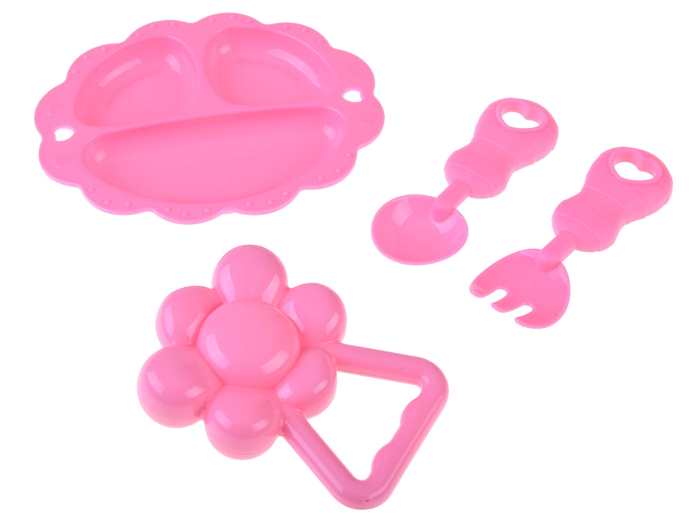 Το ροζ πιατάκι, κουταλάκι, πιρουνάκι και η κουδουνίστρα ενισχύουν το παιχνίδι ρόλων και την ανάπτυξη φαντασίας και δεξιοτήτων λεπτής κινητικότητας.