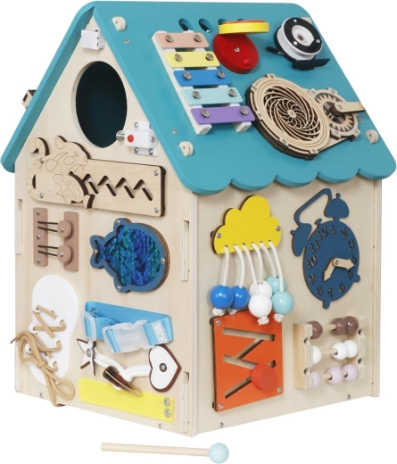 Αυτό το ποιοτικό ξύλινο activity board σε σχήμα σπιτιού είναι εμπνευσμένο από τις αρχές Montessori και ενθαρρύνει τα παιδιά να εξερευνούν αυτόνομα. Κάθε πλευρά προσφέρει νέα ερεθίσματα – από πραγματικές κλειδαριές και γάντζους μέχρι περιστρεφόμενο χρονοδιακόπτη και πολύχρωμο λαβύρινθο με ψαράκι. Το εσωτερικό του σπιτιού φωτίζεται και ο λειτουργικός διακόπτης με φωτάκι ενισχύει την αισθητηριακή εμπειρία. Το τηλέφωνο με μελωδίες ψυχαγωγεί με ήχους, ενώ το ξυλόφωνο με μπαγκέτα αναπτύσσει τον ρυθμό και την ακοή.