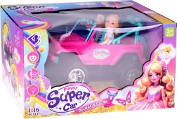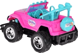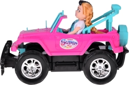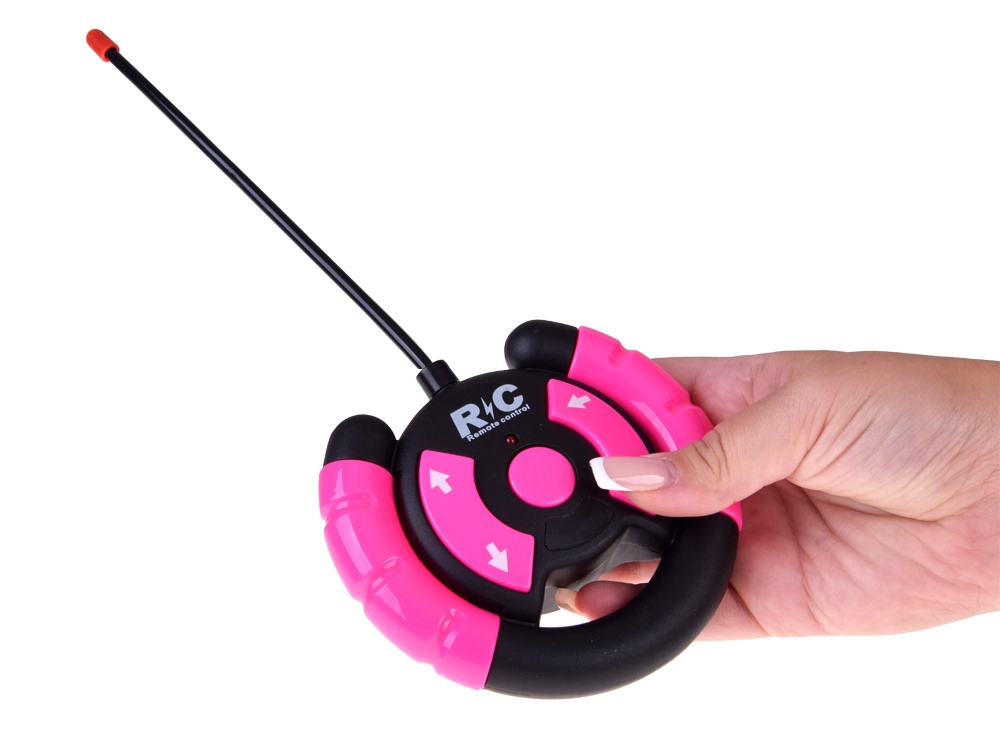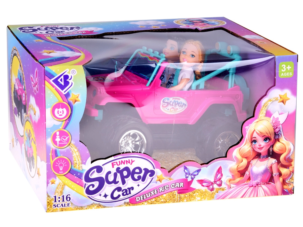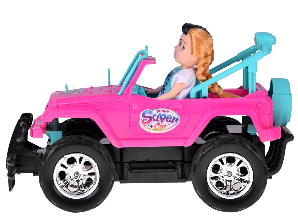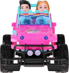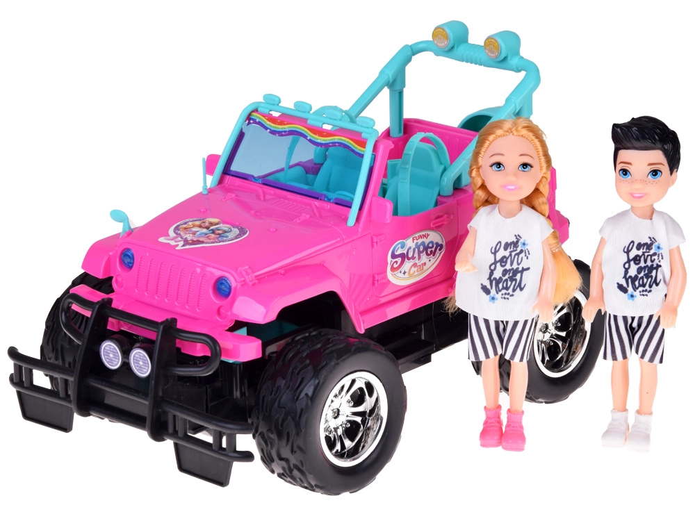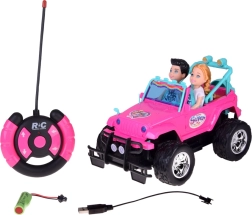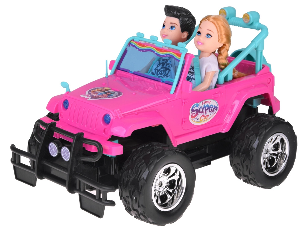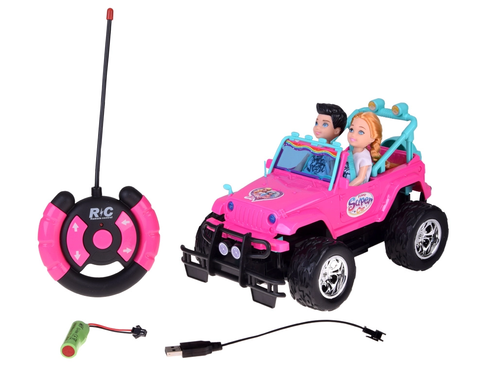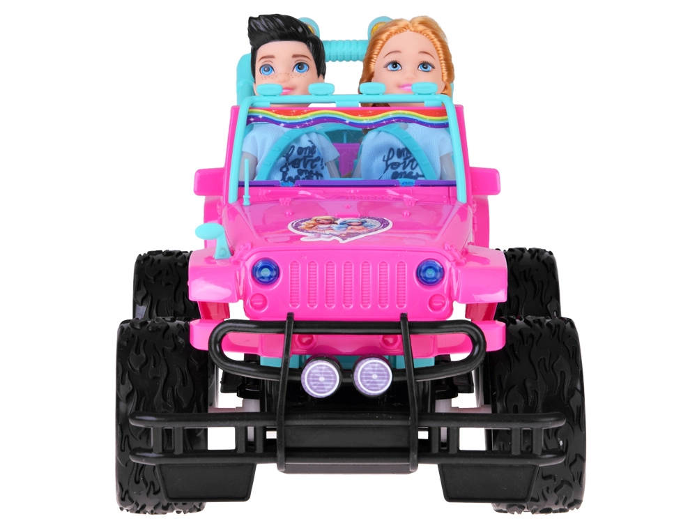 Διασκεδαστικό σετ για μικρές και μικρούς οδηγούς: ροζ τηλεκατευθυνόμενο off‑road αυτοκίνητο με μεγάλοι τροχούς και δύο φιγούρες (κορίτσι και αγόρι). Το αυτοκίνητο έχει φωτιζόμενα μπροστινά φώτα, λάστιχα από καουτσούκ για καλή πρόσφυση, ρυθμιζόμενες ζώνες ασφαλείας στα καθίσματα και χειρισμό σε 4 κατευθύνσεις με ροζ χειριστήριο. Περιλαμβάνει επαναφορτιζόμενη μπαταρία 3,7 V με φόρτιση USB.