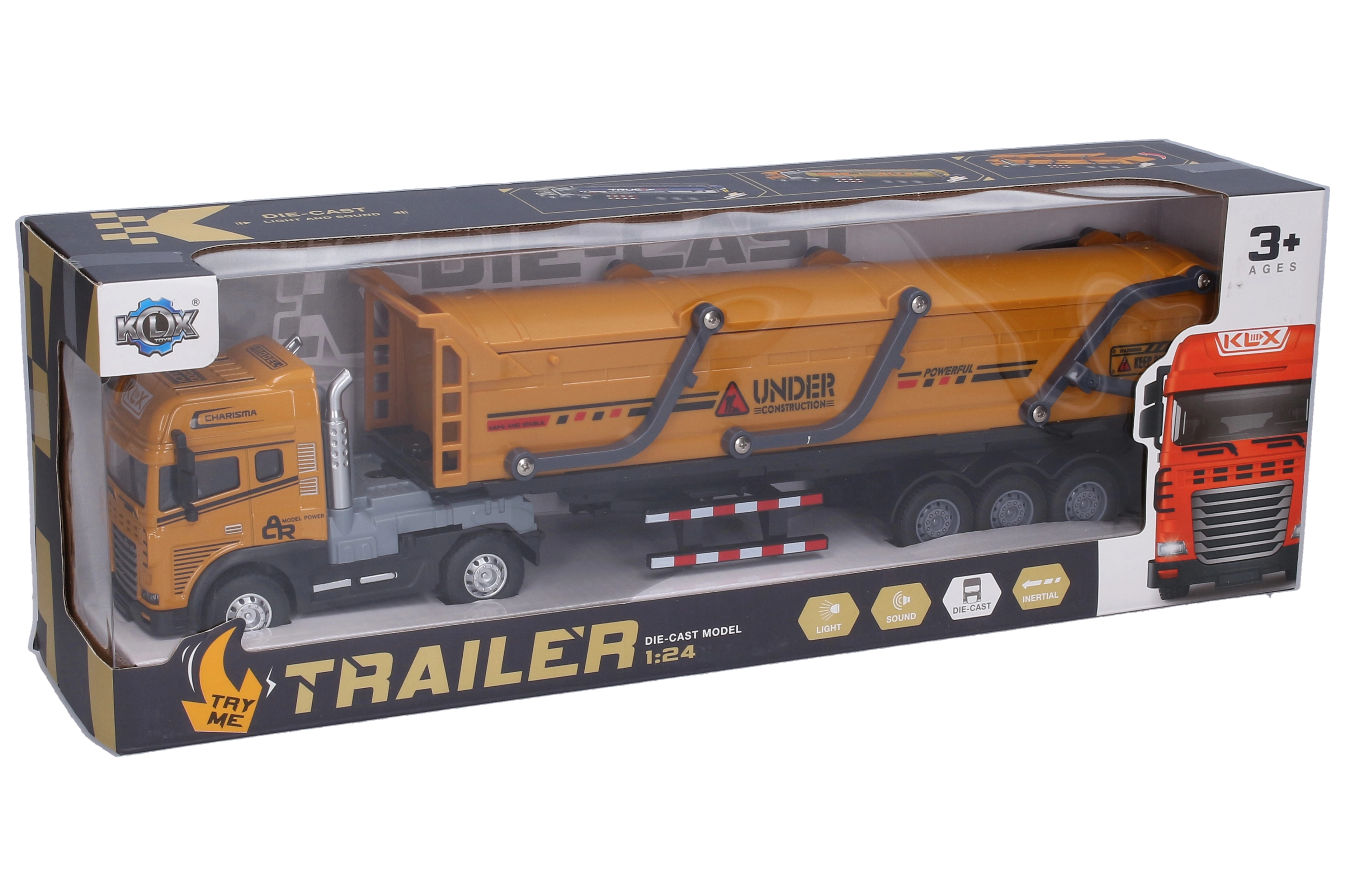 Ο στιβαρός μεταλλικός τράκτορας με ανατρεπόμενο ημιρυμουλκούμενο θα ενθουσιάσει τους μικρούς οδηγούς με τον ρεαλιστικό σχεδιασμό και τις λειτουργίες του. Προσφέρει μηχανισμό αδράνειας για ομαλή κίνηση, φωτεινά και ηχητικά εφέ με ενεργοποίηση από την κίνηση των μπροστινών τροχών, και πρακτικό μοχλό κλειδώματος του ρυμουλκούμενου. Το ρυμουλκούμενο μπορεί να αποσυνδεθεί εύκολα. Οι μπαταρίες 3× AG13 περιλαμβάνονται στη συσκευασία.
