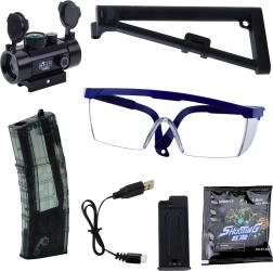 - πιστόλι ζελέ MK7, μπαταρία 7,4 V Li, καλώδιο USB, 2 γεμιστήρες, οπτικός σκοπευτής, προστατευτικά γυαλιά, τακτικό κοντάκι, σακουλάκι με σφαιρίτσες ζελέ για μούλιασμα, αυθεντικό κουτί