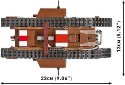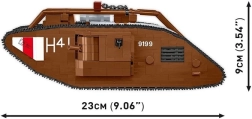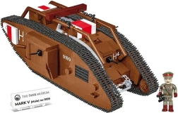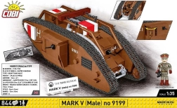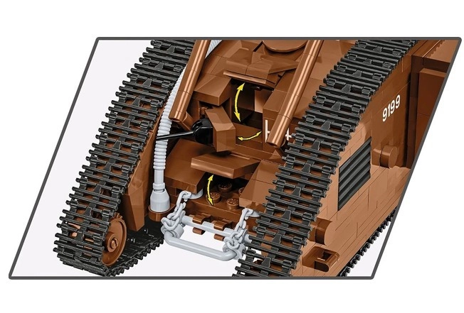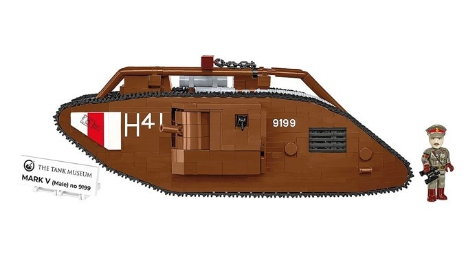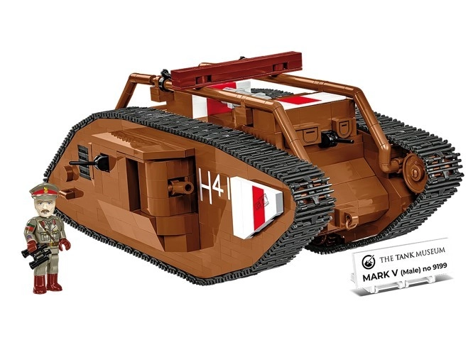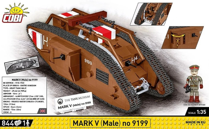 Αυτό το προσεγμένα κατασκευασμένο μοντέλο του θρυλικού βρετανικού άρματος MARK V (Male) βασίζεται στο αυθεντικό μουσειακό έκθεμα αρ. 9199 του The Tank Museum στο Bovington. Χάρη στην κλίμακα 1:35 ταιριάζει άριστα με φιγούρες και άλλα μοντέλα COBI. Μόνιμες εκτυπώσεις χωρίς αυτοκόλλητα, λειτουργική κίνηση ερπυστριών και λεπτομερής σχεδίαση το καθιστούν ελκυστικό κομμάτι συλλογής.