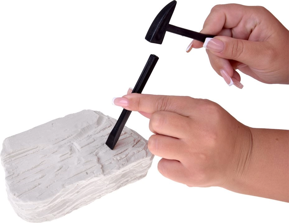 Δύο σμίλες, ένα σφυράκι και ένα πινέλο επιτρέπουν στα παιδιά να σκαλίζουν σταδιακά και να καθαρίζουν απαλά το εύρημα – ακριβώς όπως σε μια πραγματική ανασκαφή.